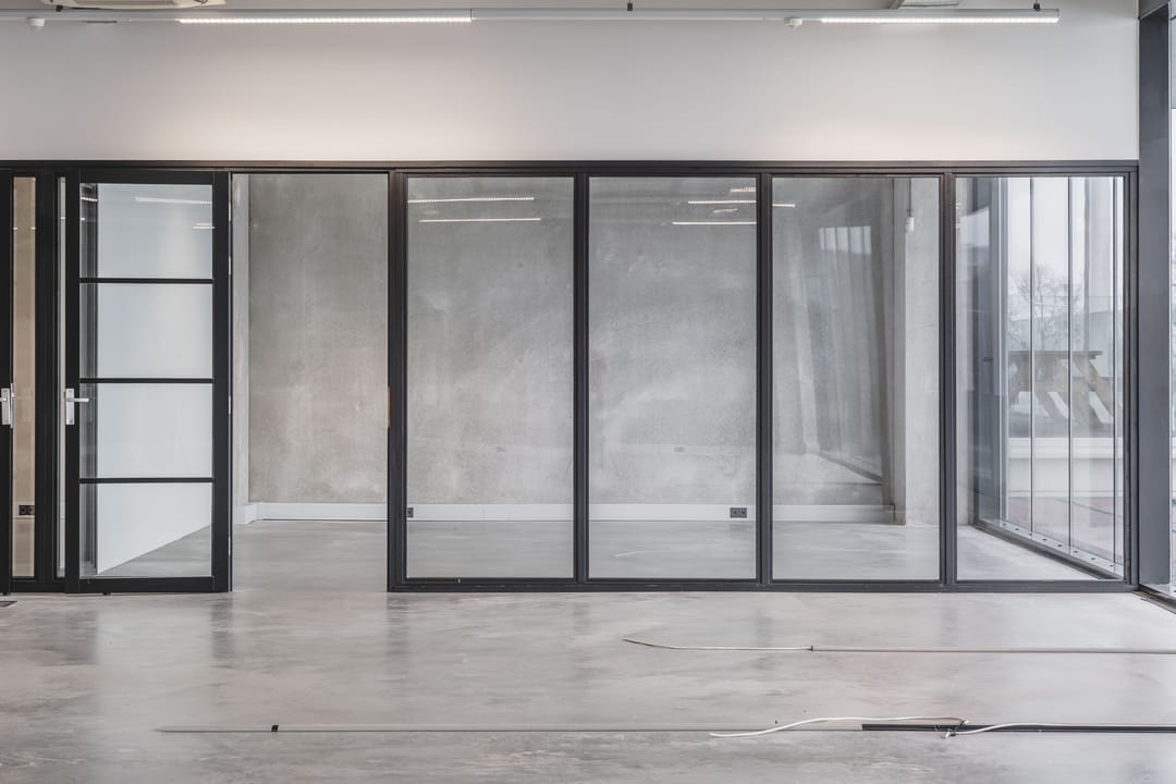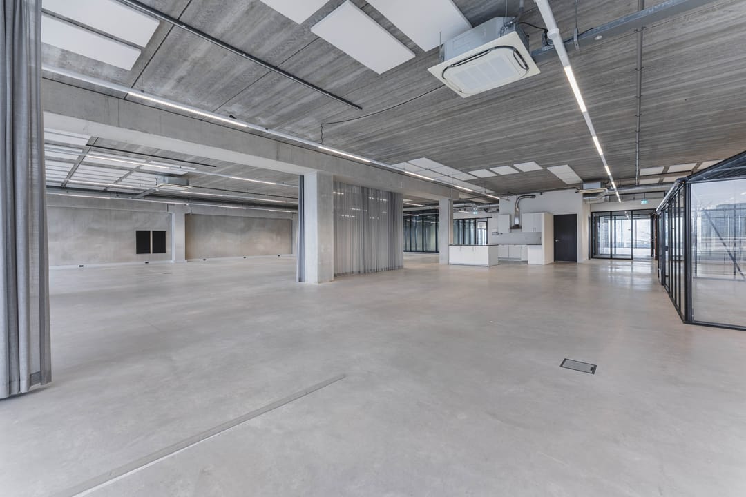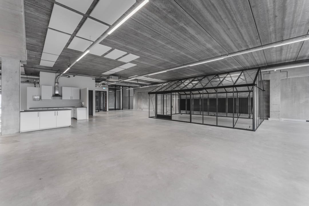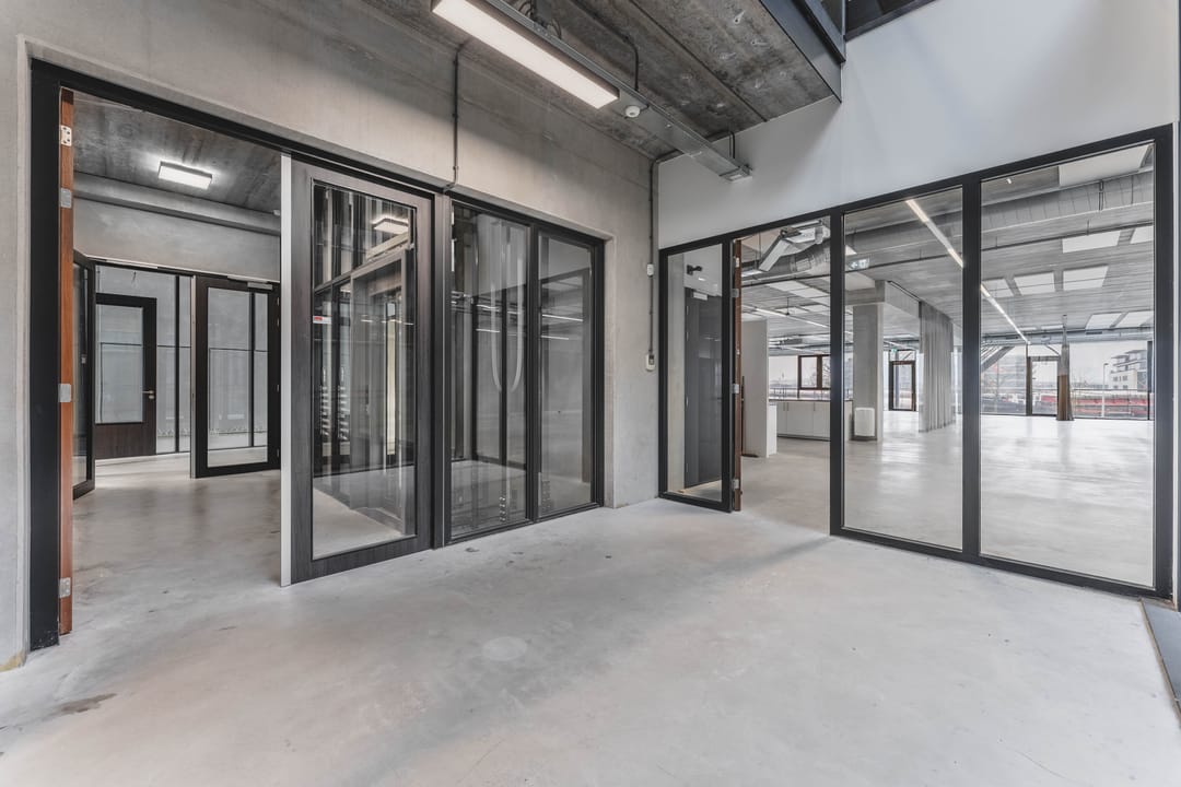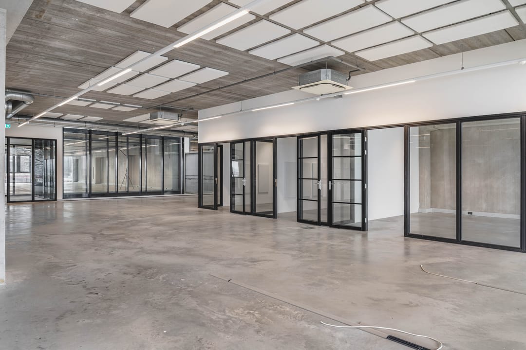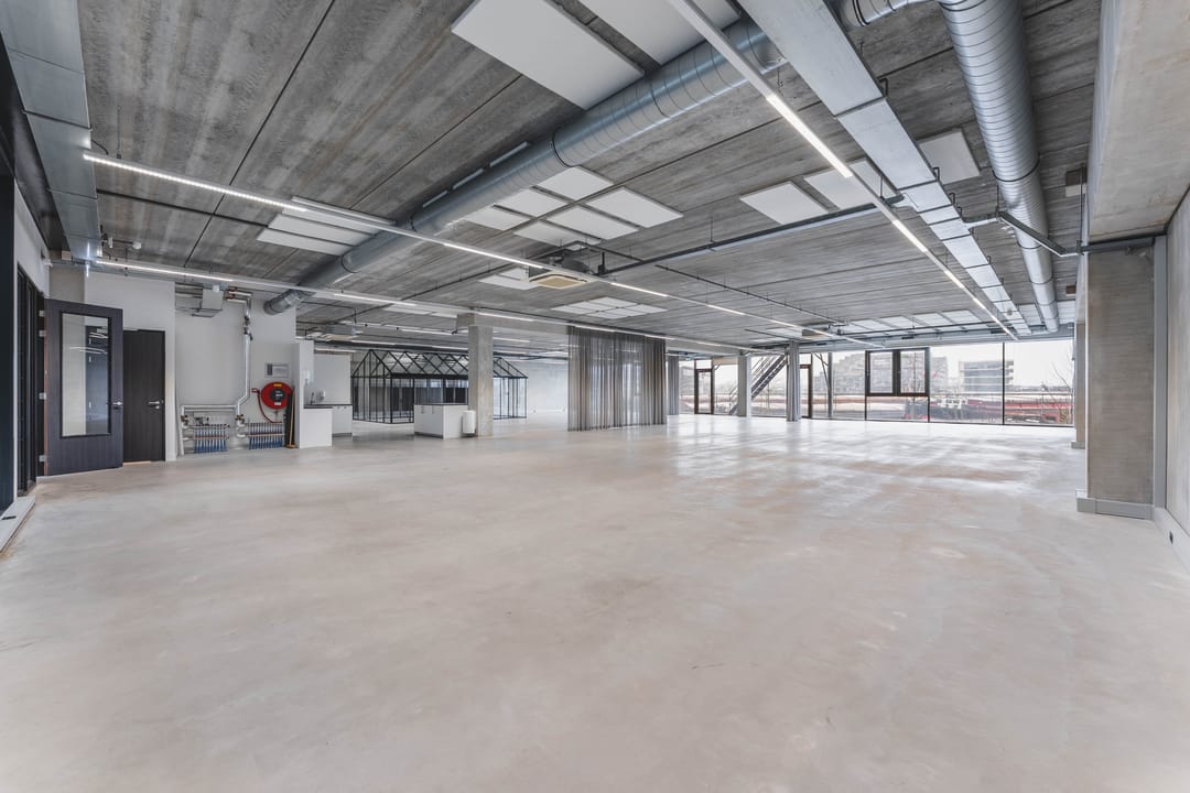 De ruimte kenmerkt zich door hoge plafonds, grote raampartijen en een industriële uitstraling. Zwarte kozijnen en strakke lijnen geven het kantoor een hoogwaardige en eigentijdse look. De kantoorvloeren worden leeg opgeleverd zodat een huurder volledige vrijheid heeft in indeling en branding.