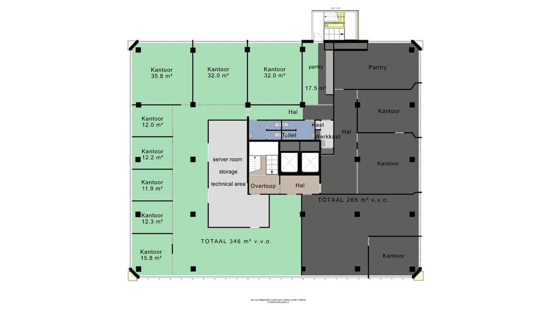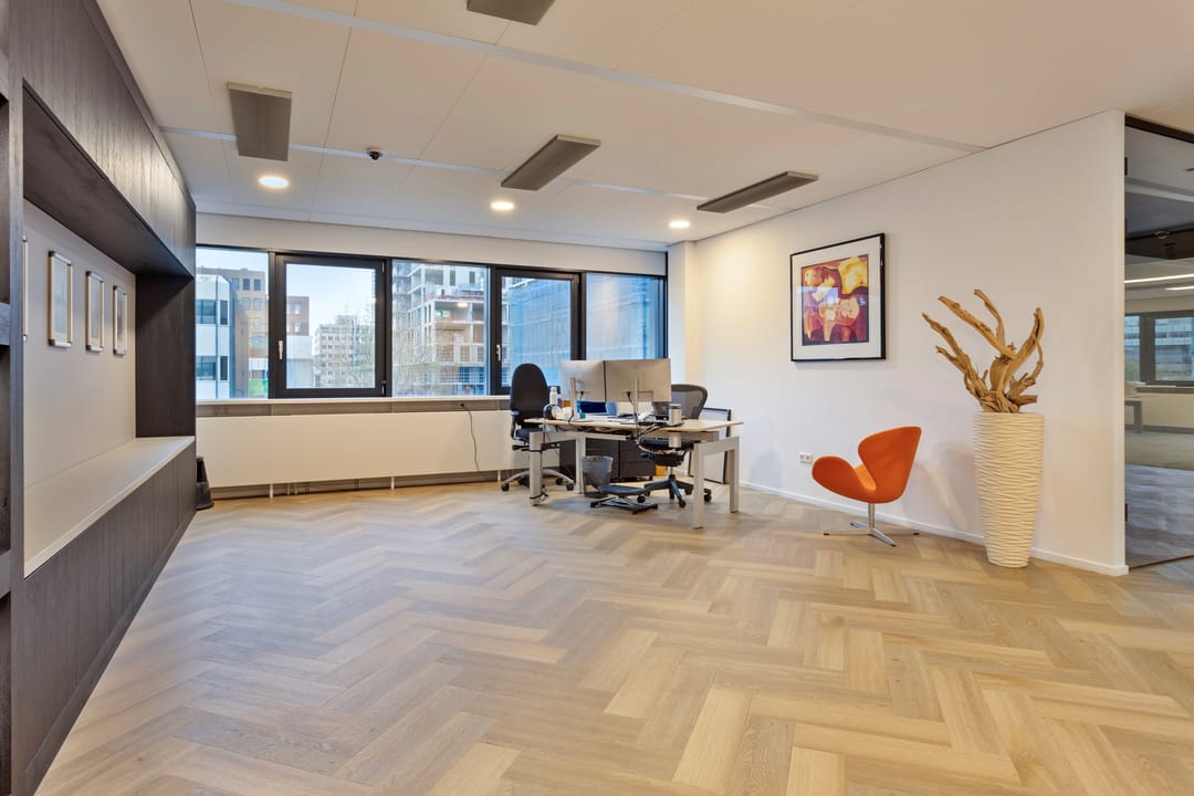 De ruimte is gesitueerd aan de linkerzijde van de verdieping en kenmerkt zich door veel daglicht en een prettige werkomgeving. Dankzij de bestaande indeling en het aanwezige inbouwpakket is de vloer direct te betrekken.