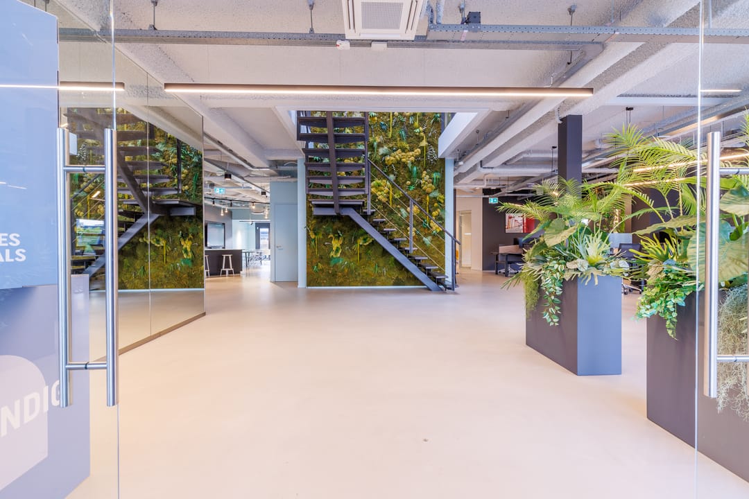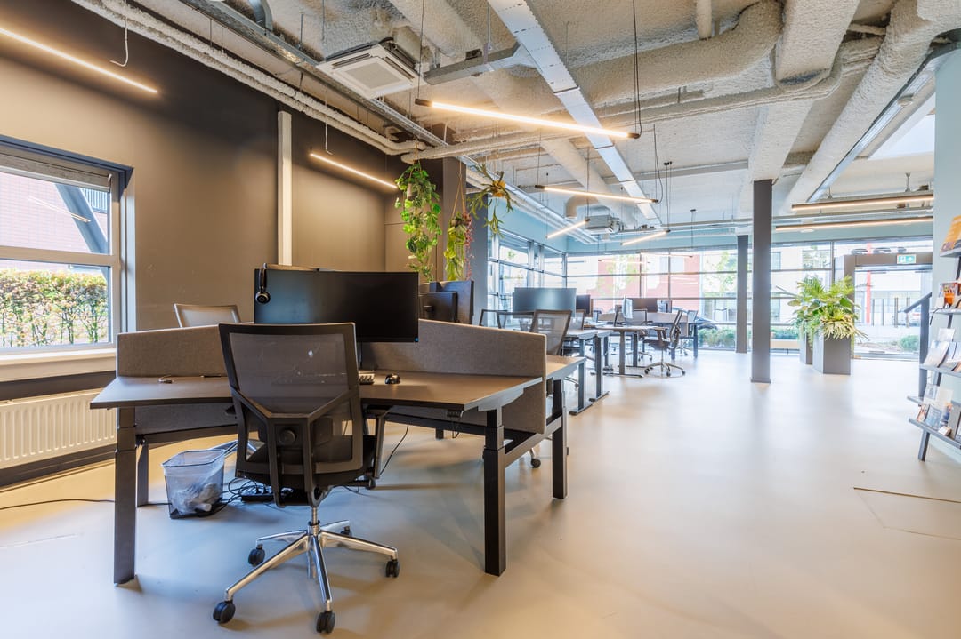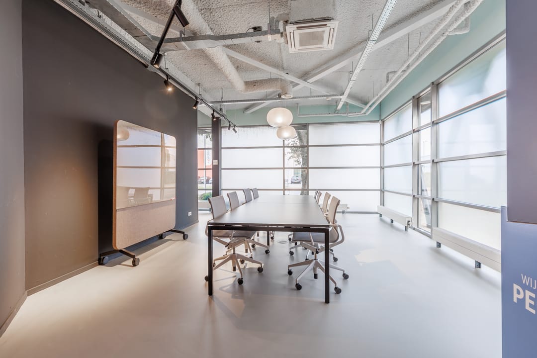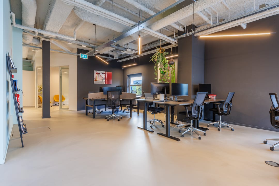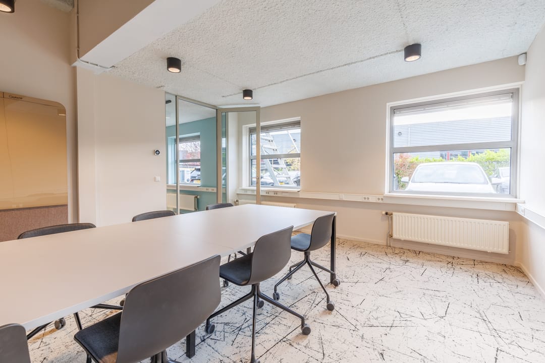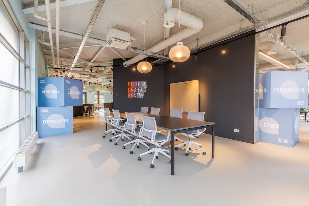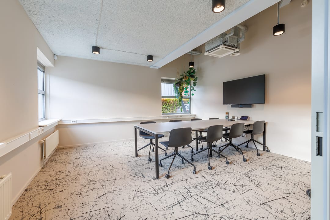 De ruimte is ingedeeld met zowel open kantoorruimte als afgesloten vergader-/werkruimte.