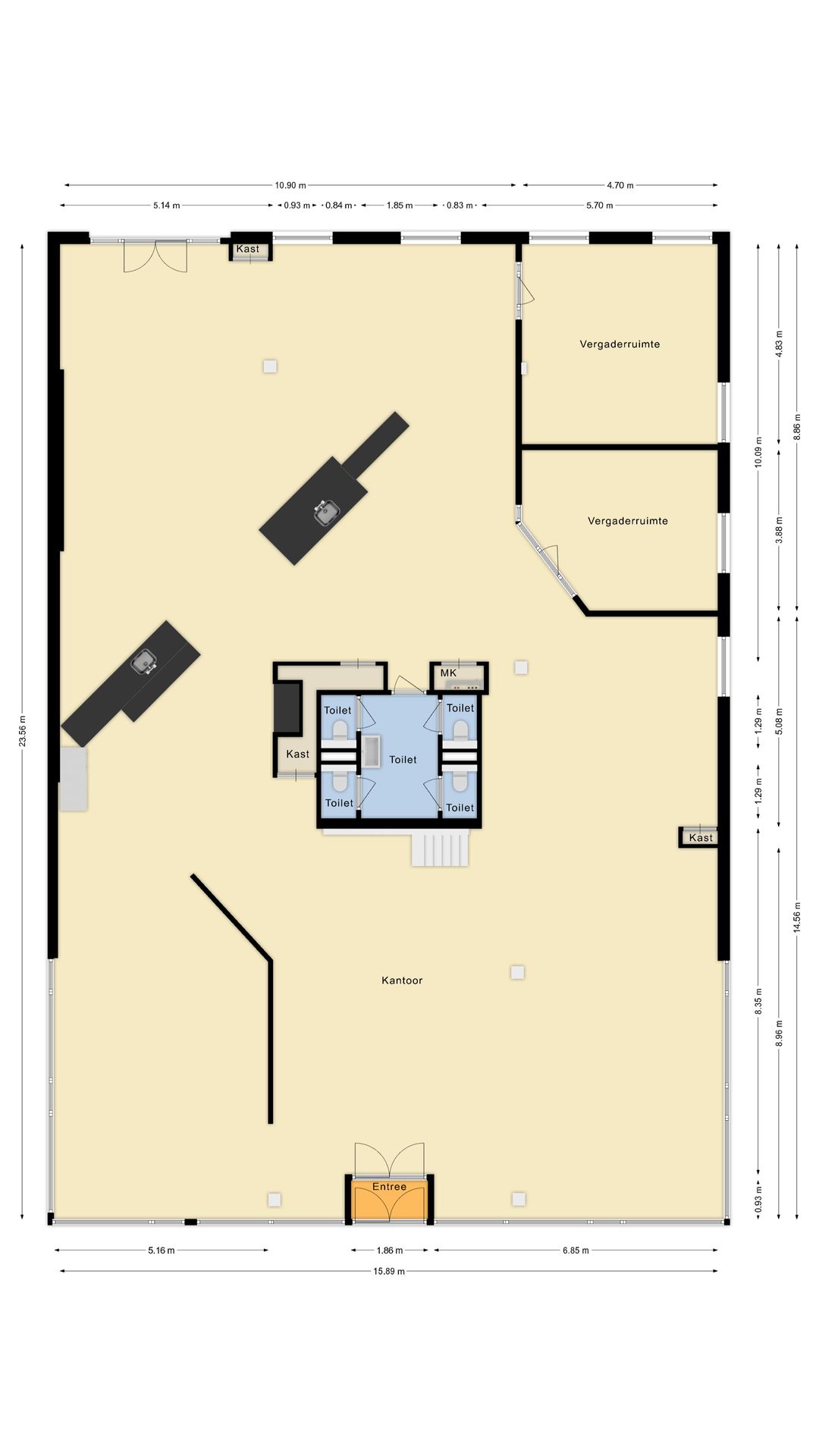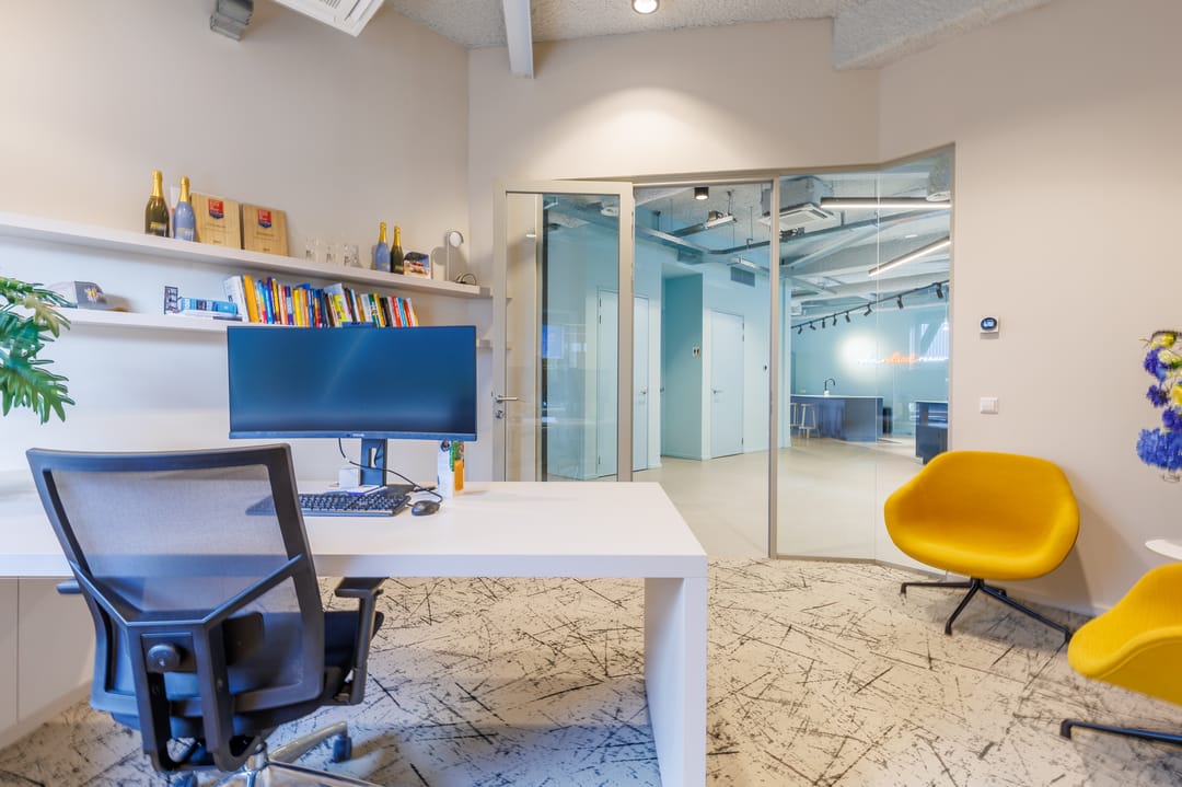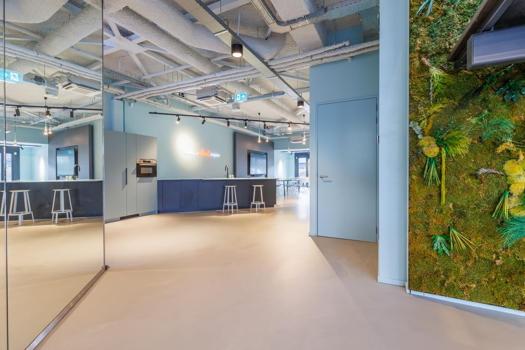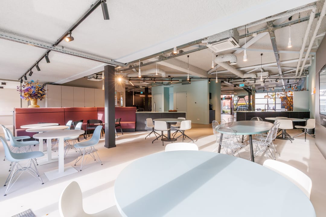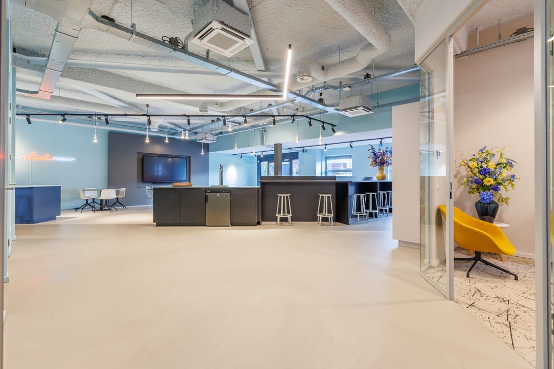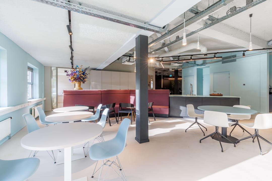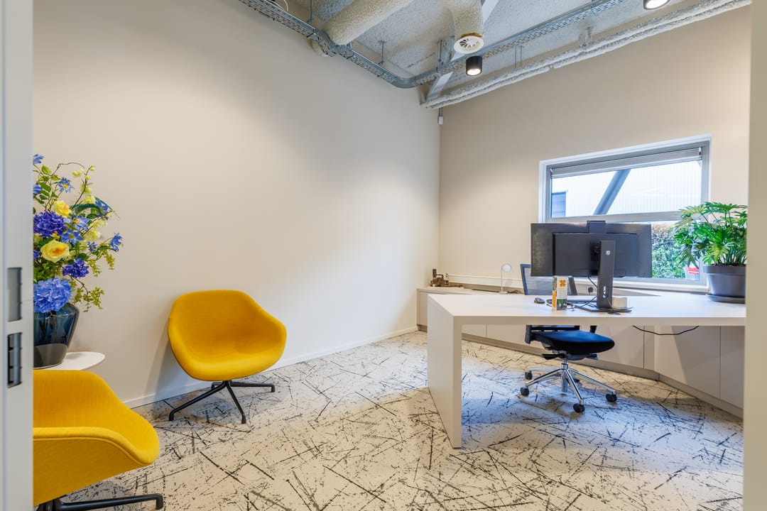De ruimte is ingedeeld met zowel open kantoorruimte als afgesloten vergader-/werkruimte.