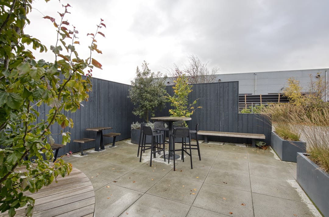 Er zijn 12 parkeerplaatsen beschikbaar voor de gebruiker van de begane grond. Aan de achterzijde van gebouw is een fietsenstalling en een lounge terras voor gemeenschappelijk gebruik.