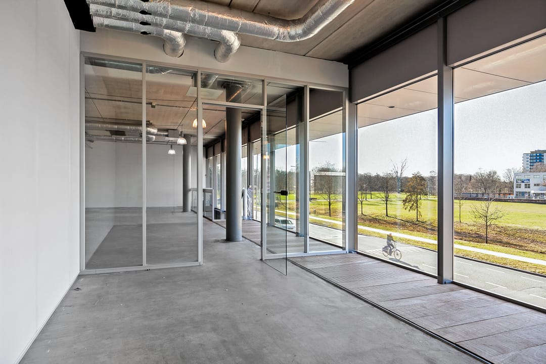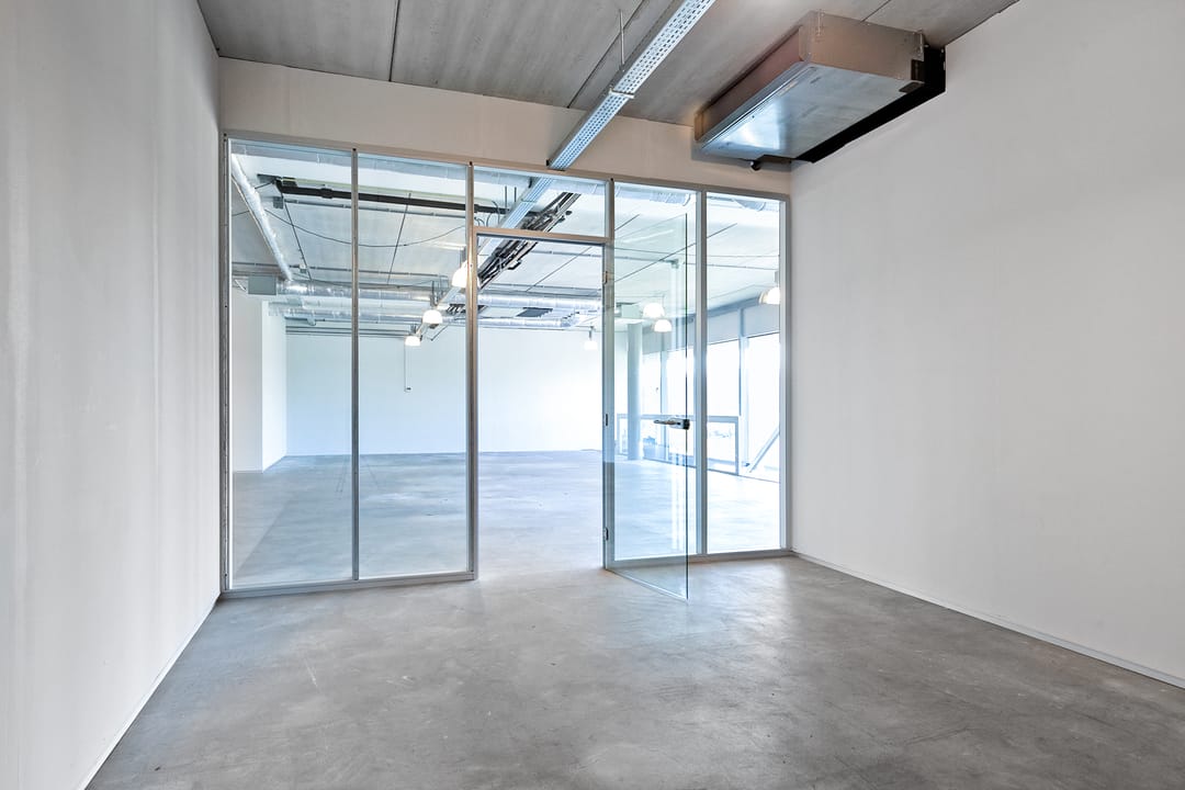 - 3 kantoren met glazen wanden van elkaar gescheiden.