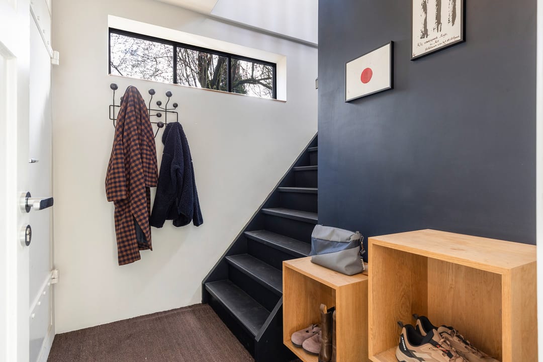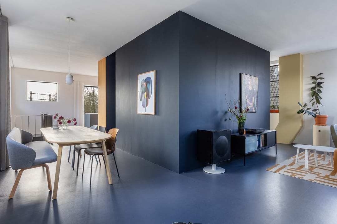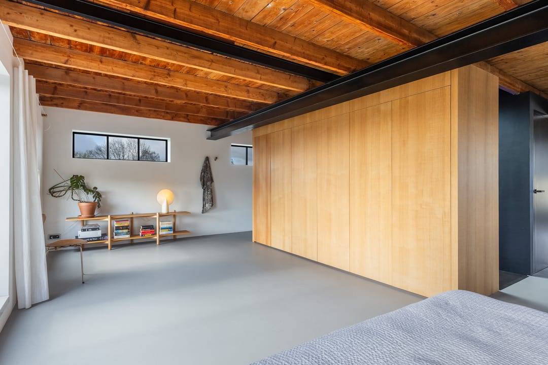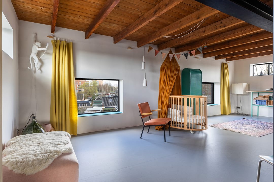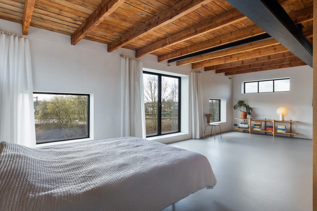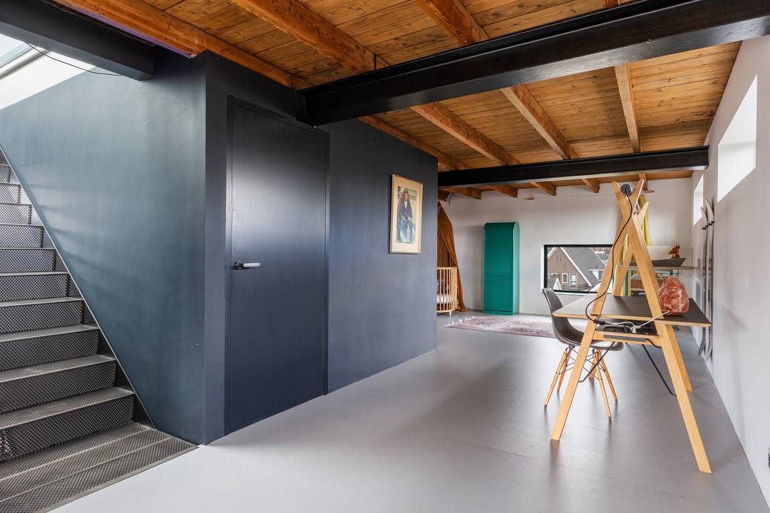2e Verdieping: via de fraaie maatwerk stalen trap bereikt u de loftachtige slaapverdieping, waar desgewenst meerdere kamers kunnen worden gerealiseerd (zie alternatieve plattegronden). Deze verdieping beschikt over een luxe badkamer (2021), uitgerust met een wastafel, toilet, ruime inloopdouche en daklicht, evenals een ruime inpandige berging. Ook hier is gekozen voor een fraaie marmoleumvloer met comfortabele vloerverwarming. Via een vaste trap bereikt u het platte dak, toegankelijk middels een elektrisch bedienbaar dakluik.