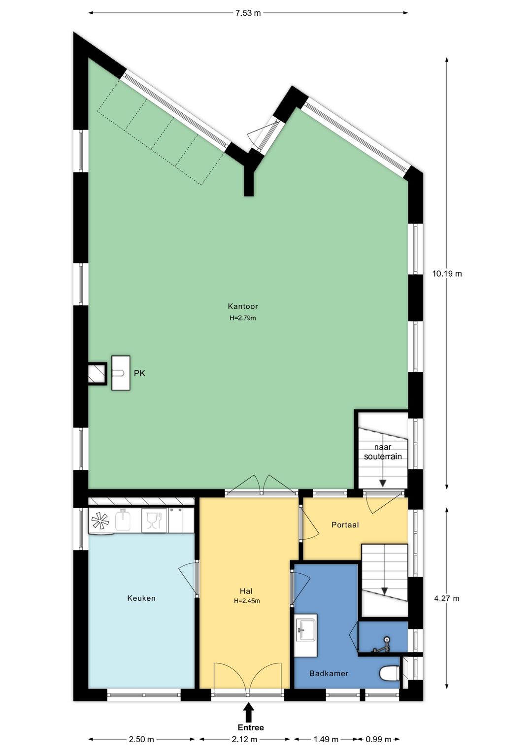 Begane grond: statige entree met fraaie dubbele deuren, ruime hal, moderne badkamer (2017) met inloopdouche, toilet en wastafelmeubel. Keukenruimte (2019) voorzien van diverse inbouwapparatuur. Royaal en licht kantoor/studioruimte voorzien van een sfeervolle pelletkachel. Portaal met toegang tot het souterrain en trapopgang naar de 1e verdieping.