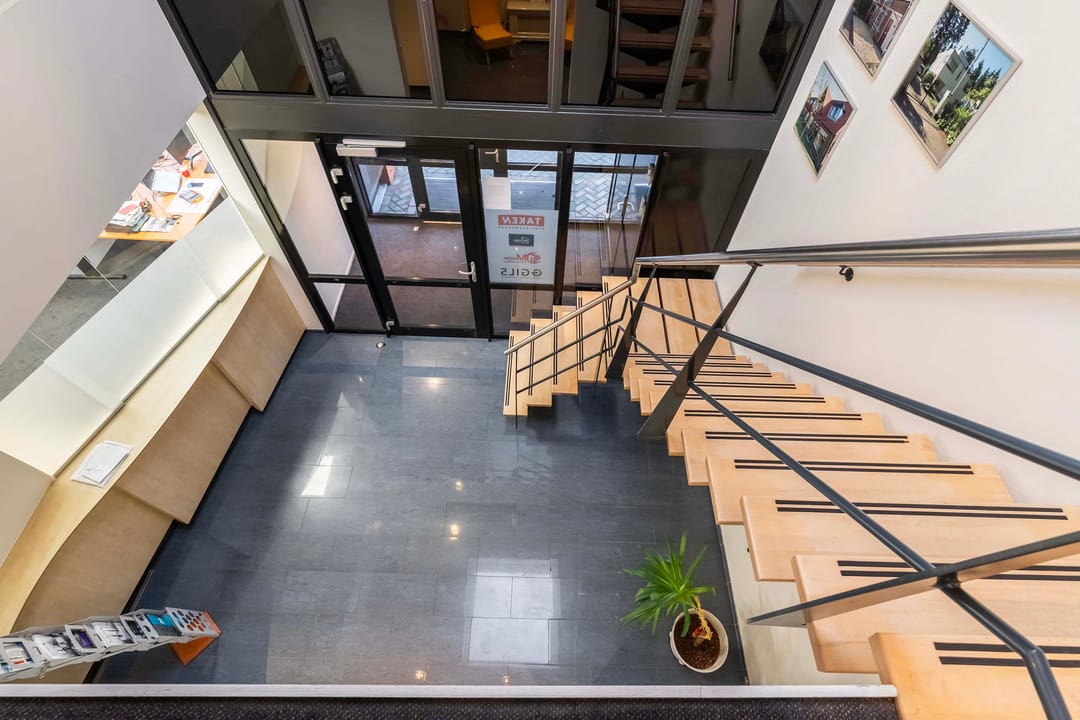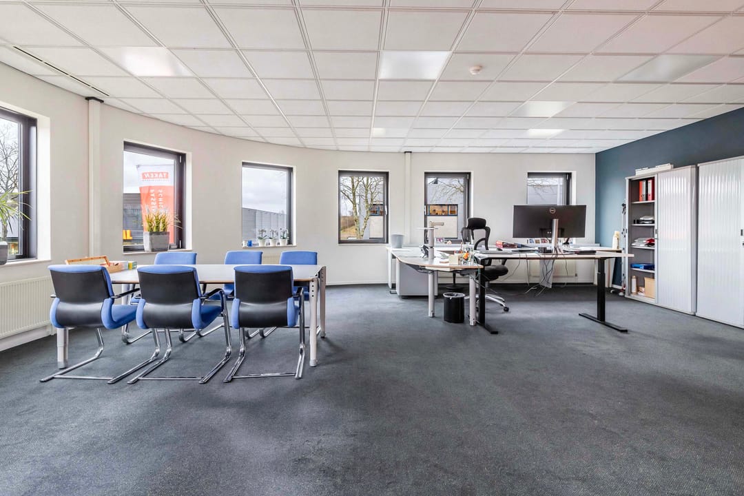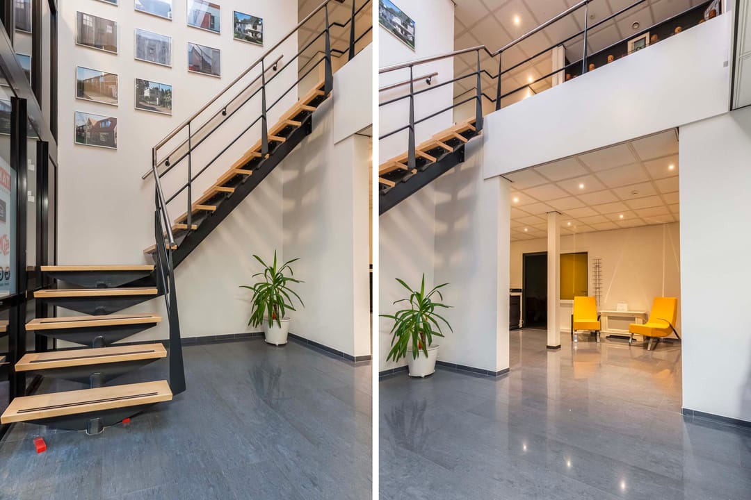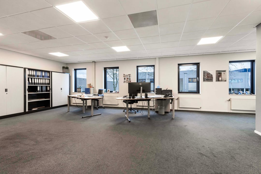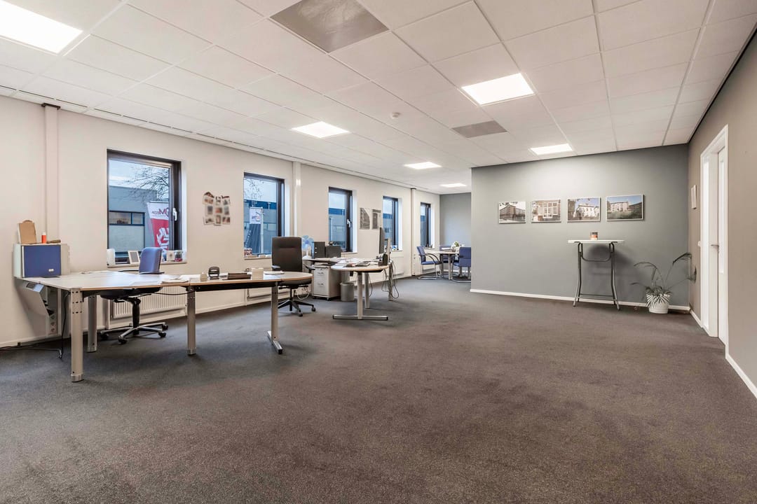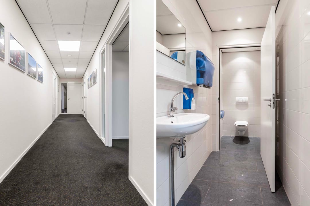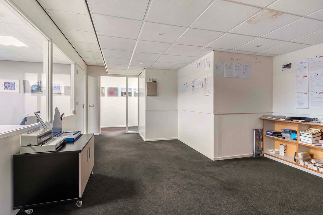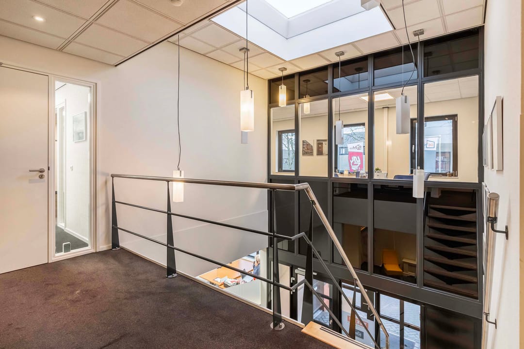 Deze kantoorruimte van ca. 220 m² (incl. mandelige ruimte) op de eerste etage biedt een ideale werkomgeving. Bij binnenkomst via de trapopgang bevinden zich aan de linkerzijde een praktische pantry en twee moderne toiletgroepen. Aan de rechterzijde vindt u de zeer ruime en lichte kantoorruimten. Aan het einde van de hal bevindt zich de directiekamer, die dankzij de vele raampartijen een panoramisch uitzicht biedt.