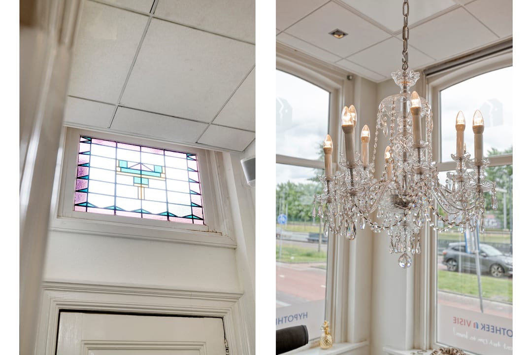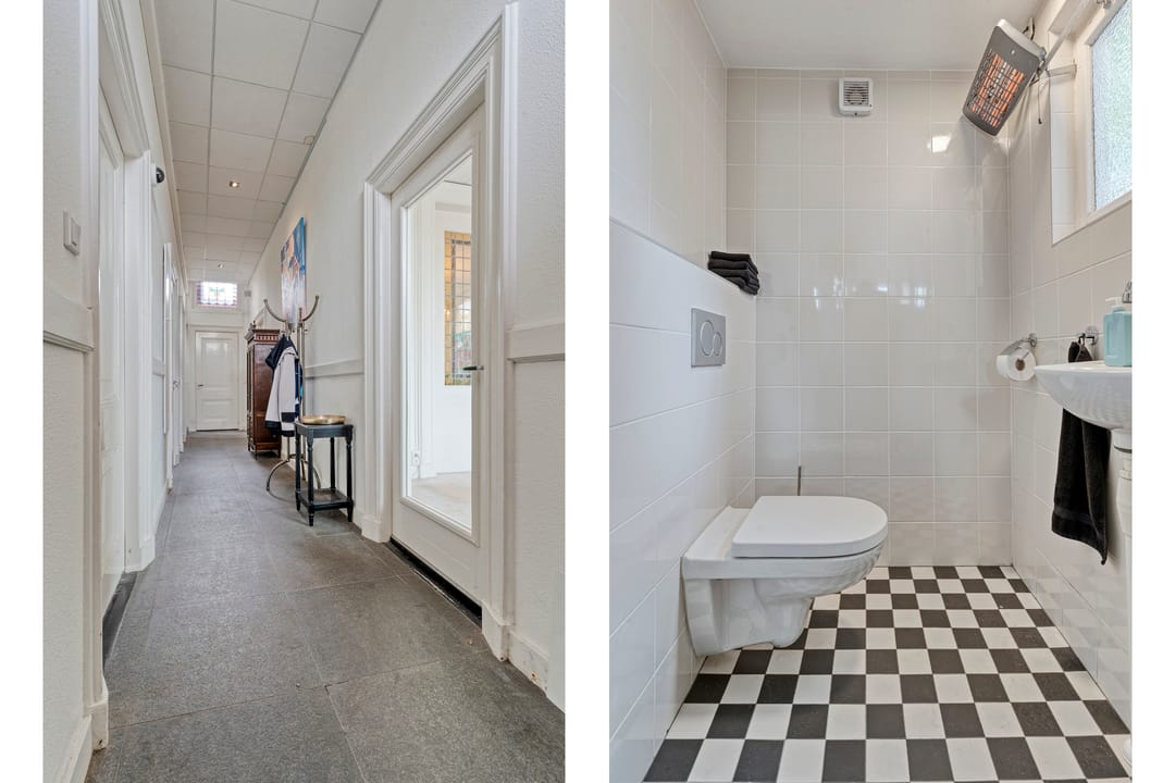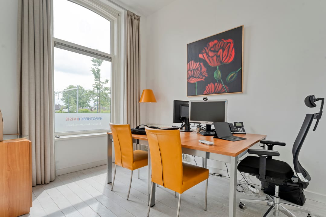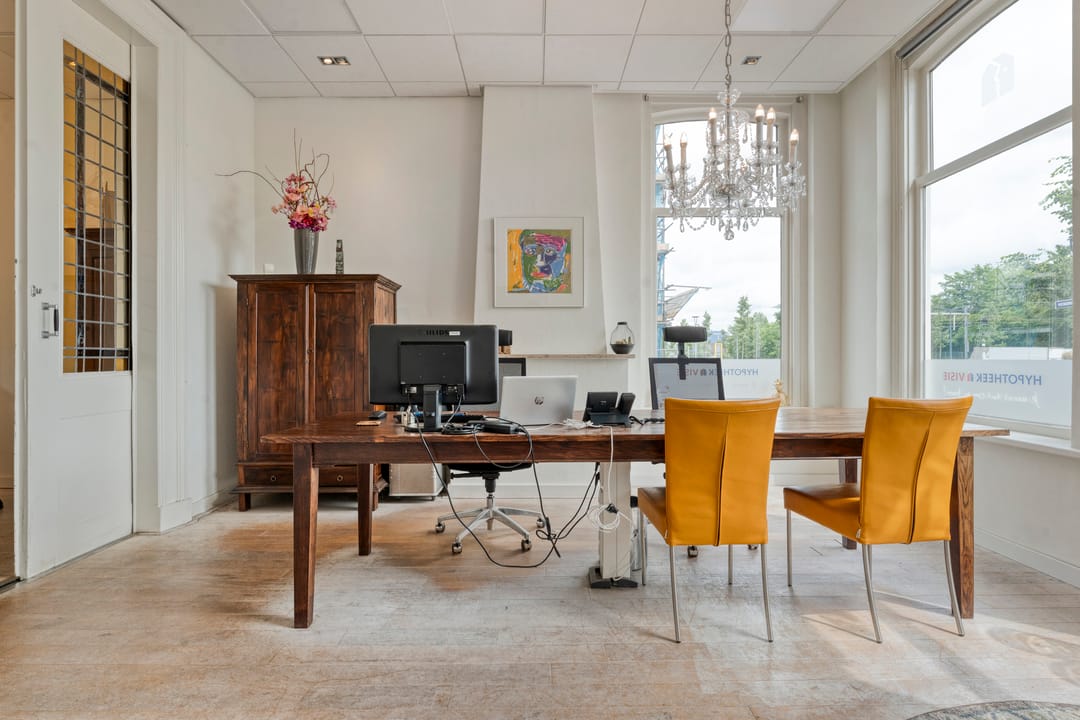 Via een imposante entree met een lange gang, originele glas-in-loodramen (met bergkast) betreed je de kantoorruimte. De stijlvolle werkomgeving omvat twee ruime, hoge kamers met fraaie ensuite-deuren en airconditioning, wat zorgt voor een representatieve én comfortabele werkplek. Aan de achterzijde geven dubbele tuindeuren toegang tot het terras. Aangrenzend bevinden zich nog twee afzonderlijke werkkamers. De pantry is voorzien van een 2-zone inductiekookplaat, koelkast en vaatwasser. Een modern toilet met fontein maakt de begane grond compleet. Deze multifunctionele ruimte is uitstekend geschikt voor zakelijke doeleinden zoals praktijk aan huis, atelier, kantoor of verhuur aan derden. Eventueel bestaat de mogelijkheid om weer een doorbraak te maken en het geheel aan elkaar te koppelen tot één imposant en statig kantoor!