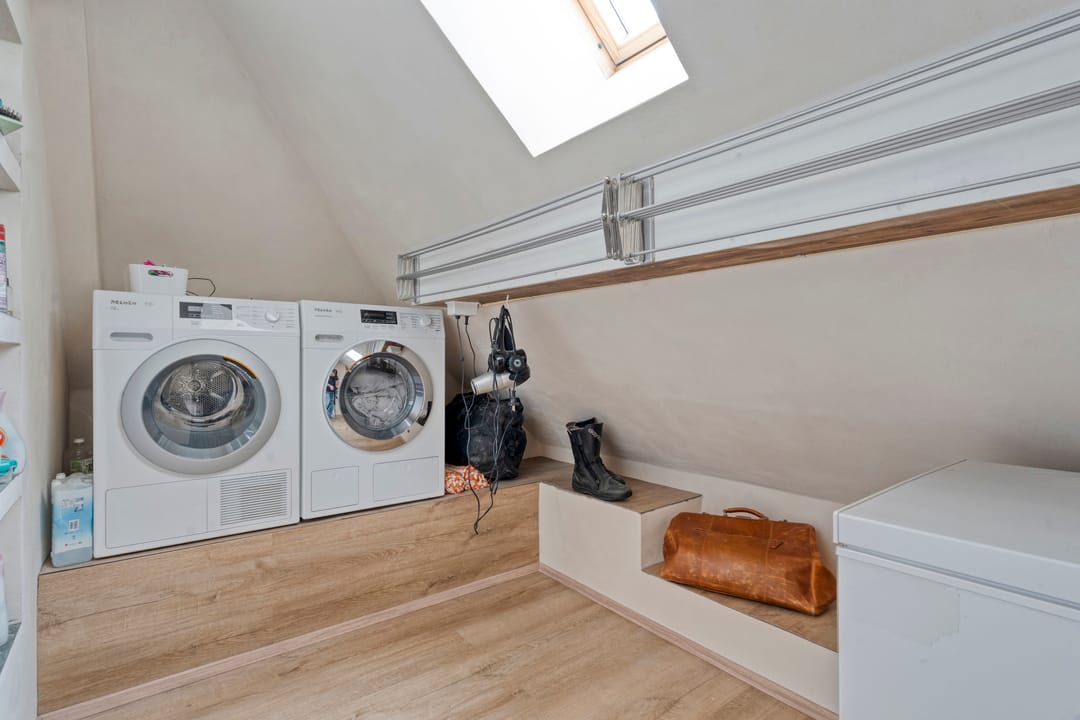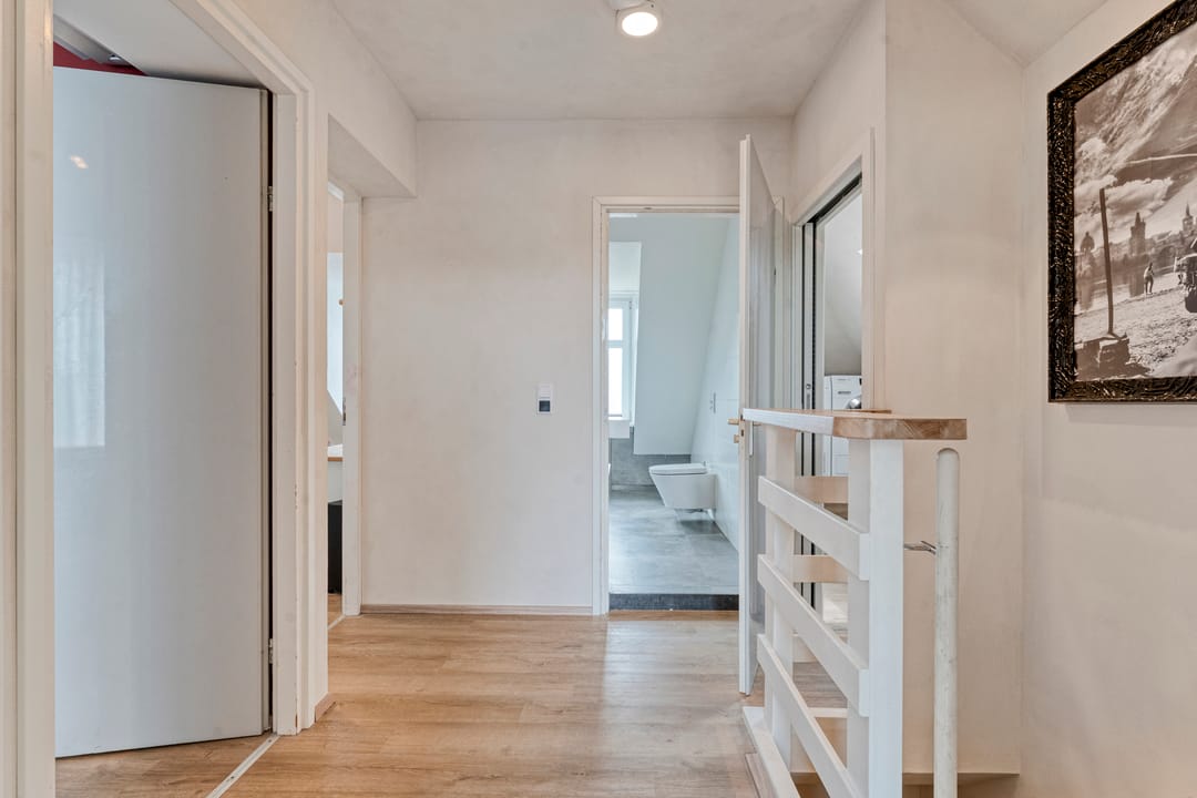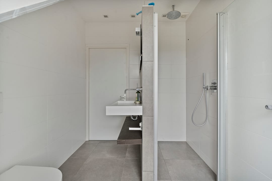 Ruime overloop met vaste kast, twee lichte slaapkamers met schuifpui naar het tweede dakterras, een aparte wasruimte met witgoedaansluitingen en een tweede moderne badkamer voorzien van inloopdouche, wastafelmeubel en toilet. Aan de voorzijde bevindt zich nog een vierde royale slaapkamer.