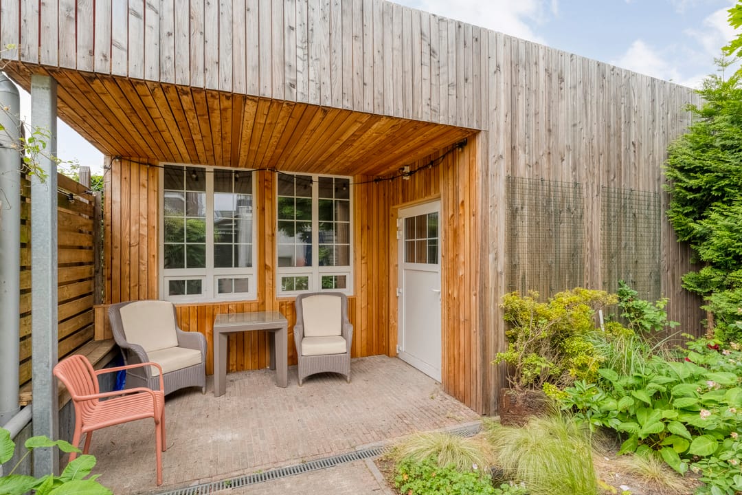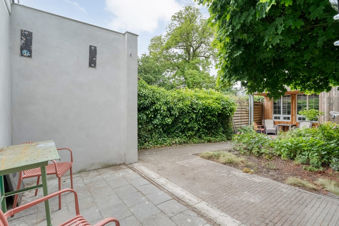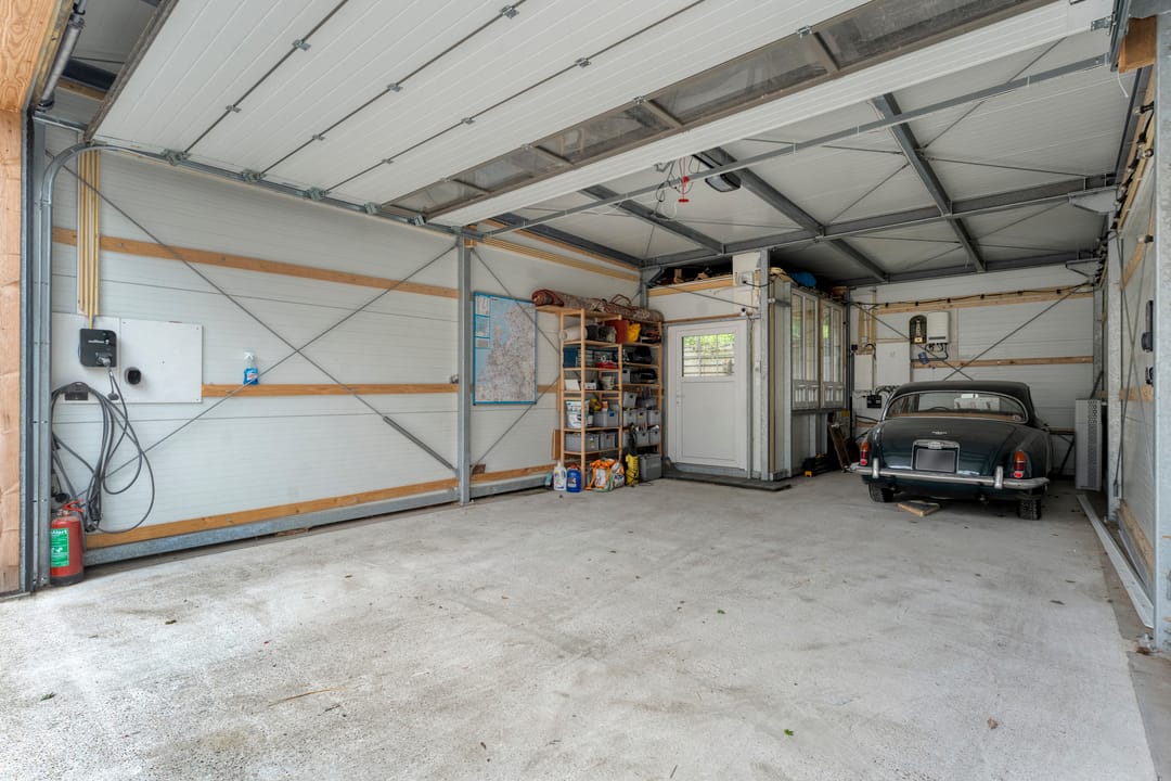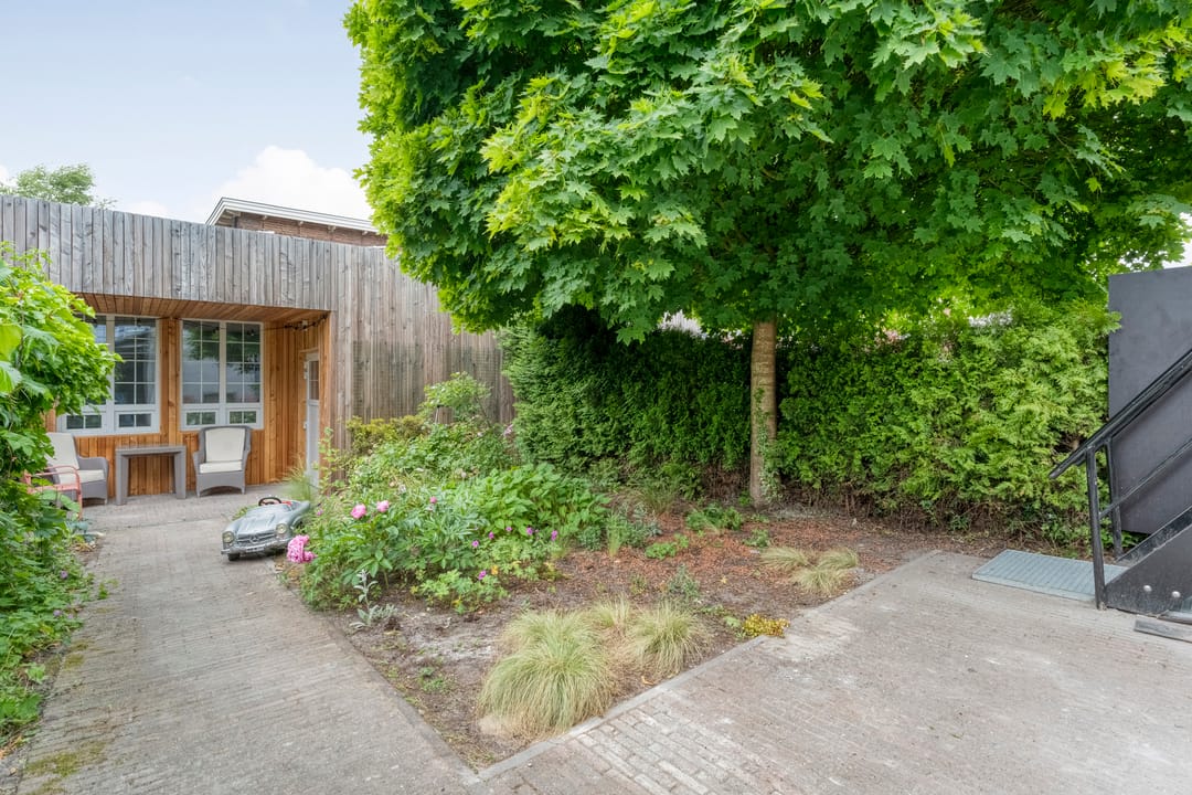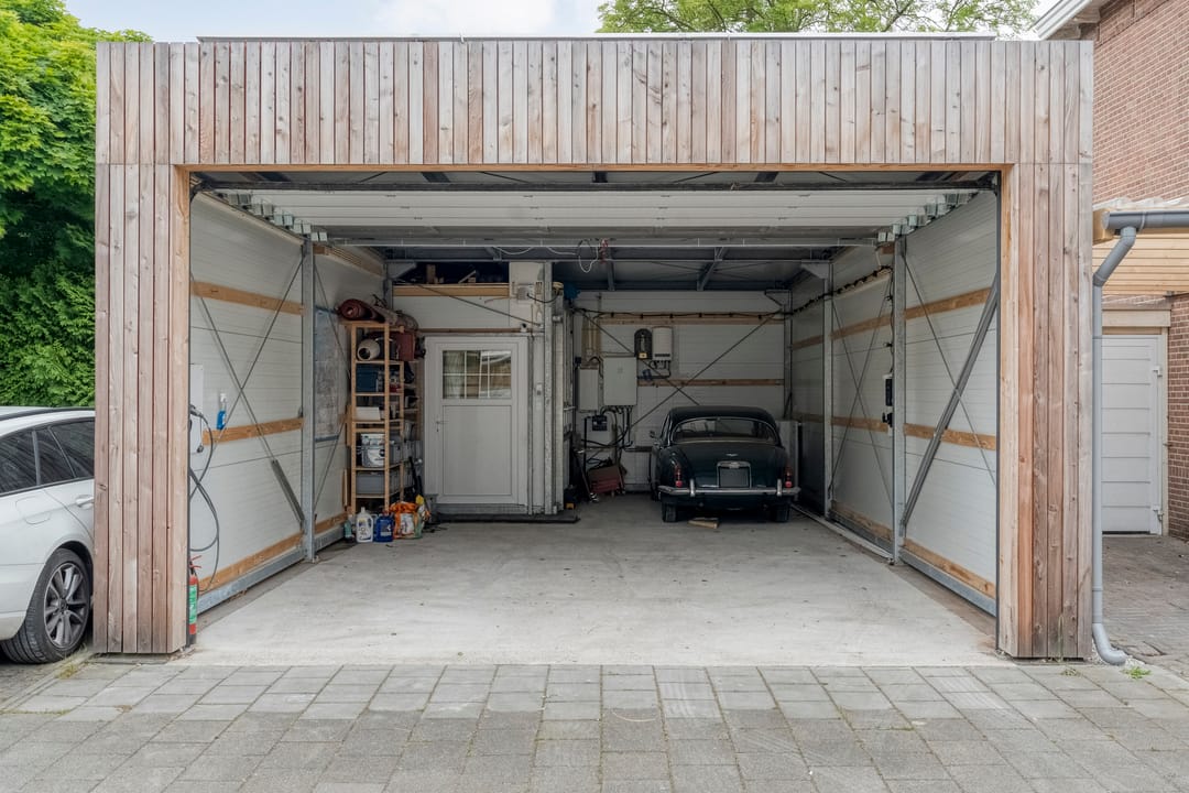 De tuin is gelegen op het westen, met volop middag- en avondzon. Achter op het perceel bevindt zich een volledig thermisch geïsoleerde garage met elektrische roldeur, muurisolatie, geïsoleerde betonvloer, twee laadpalen en een accu van 25 kWh. Verder een royale berging (voorzien van elektra, wateraansluiting en toilet). Daarnaast zijn er maar liefst vijf privéparkeerplaatsen op eigen terrein.