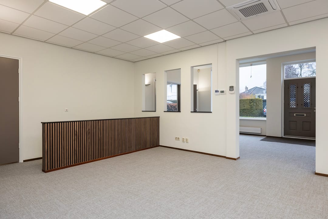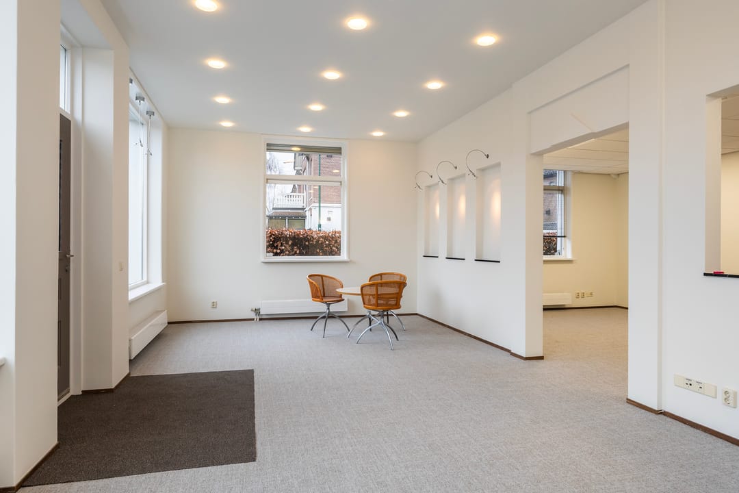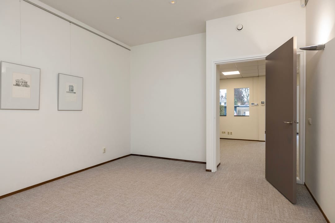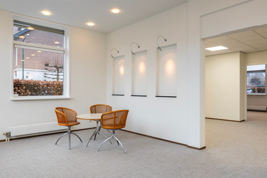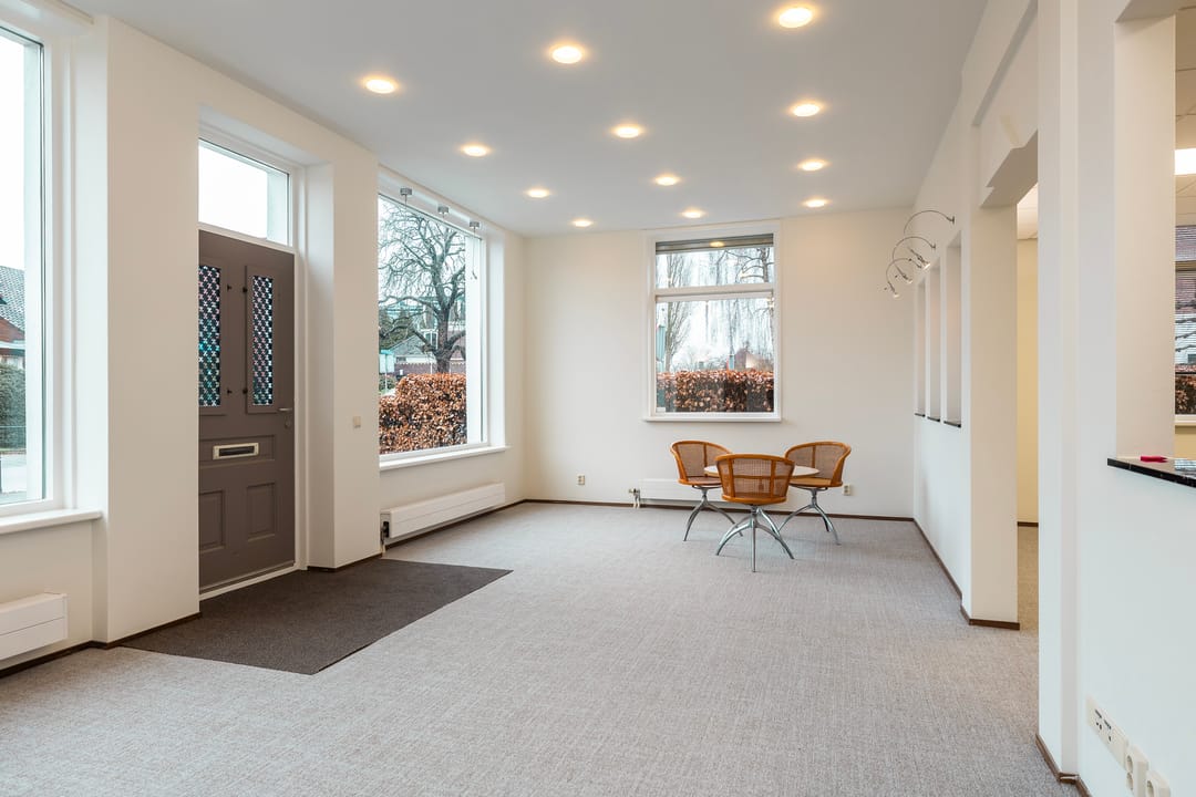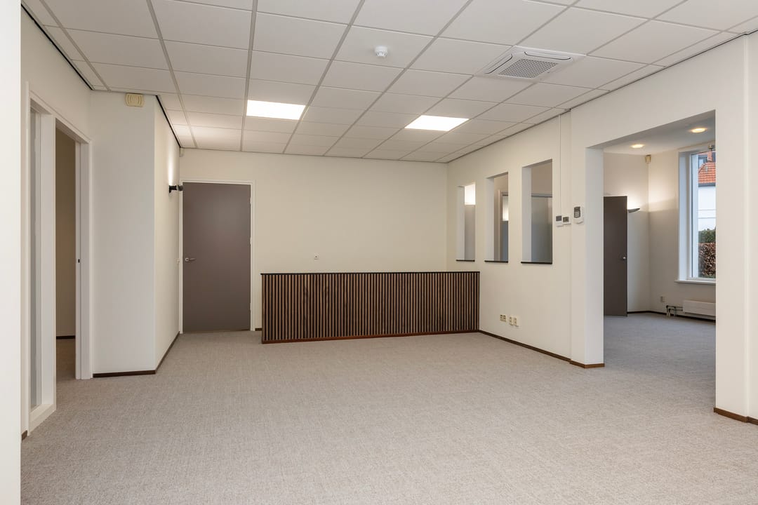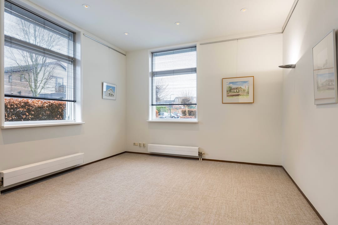 De recent gerenoveerde kantoorruimte bestaat uit een ontvangstruimte met een open doorgang naar het middengedeelte, daarachter 2 mooie werkkamers, een fraaie spreekkamer met akoestische panelen, een achterhal met 2 toiletten en keuken, alsmede een c.v-ruimte. Ook is er een trap naar een goed bruikbare en verwarmde kelder voor archief/opslag.