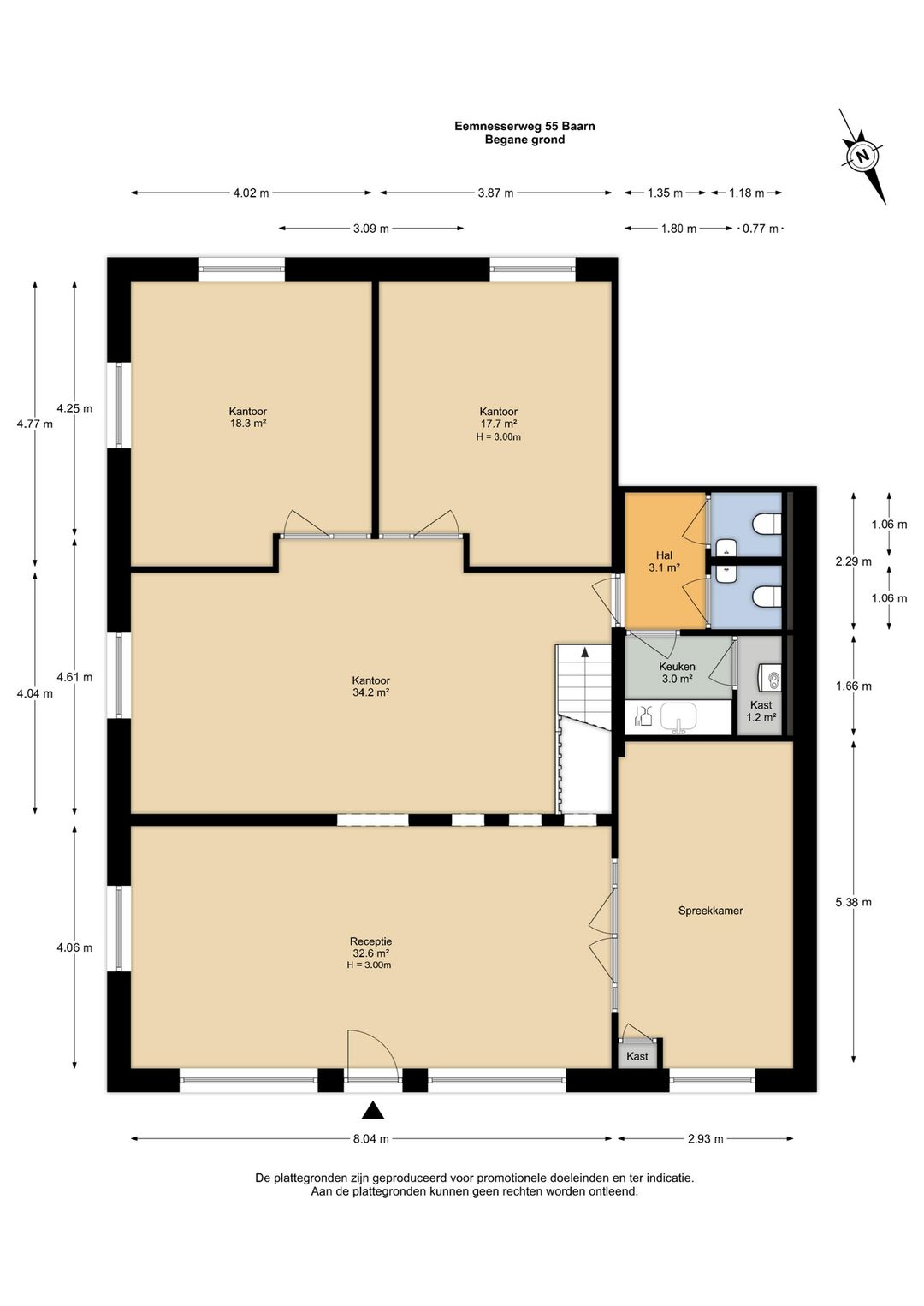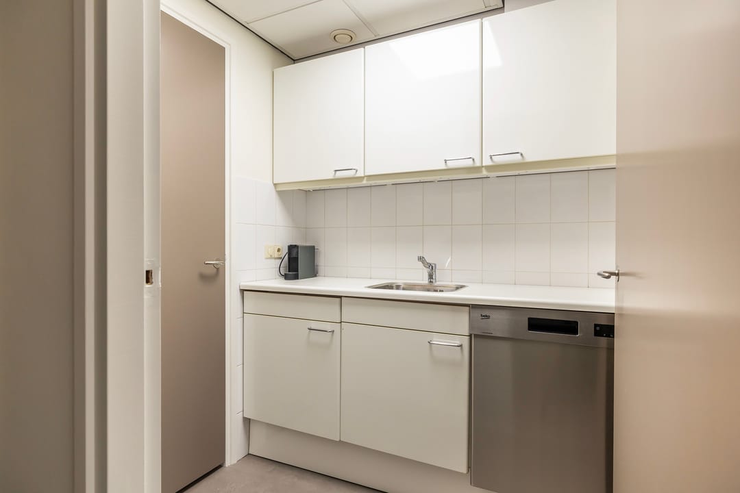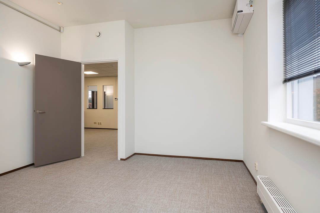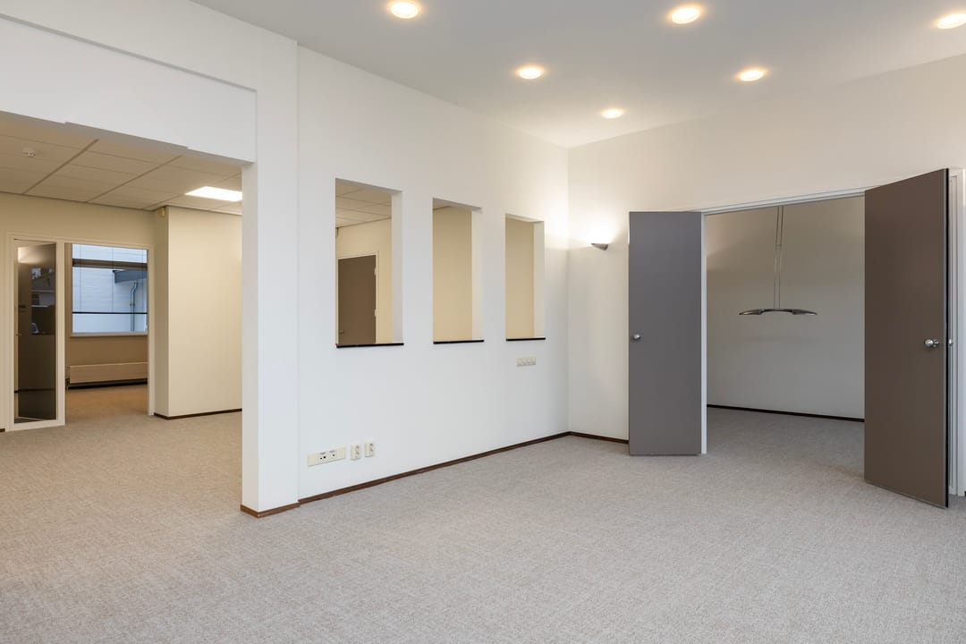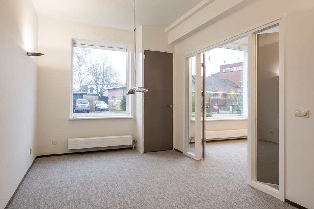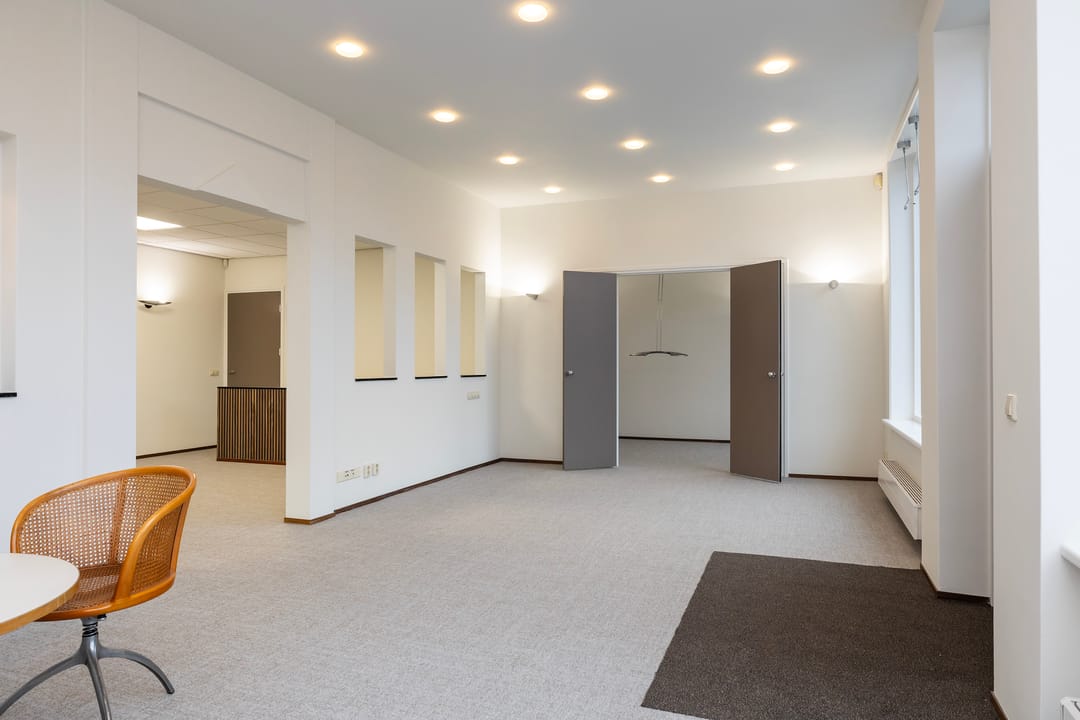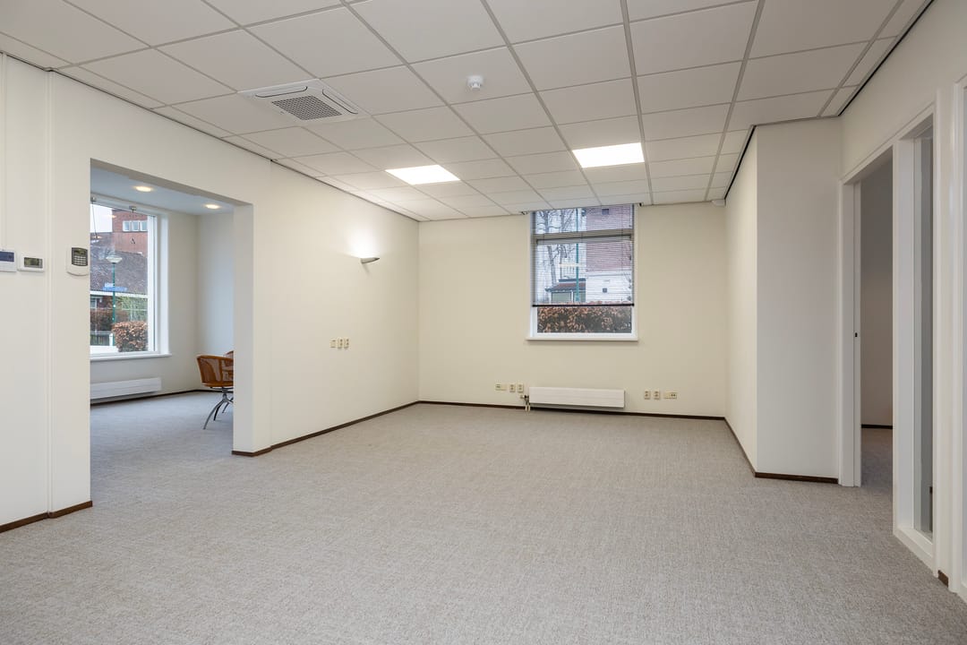 De recent gerenoveerde kantoorruimte bestaat uit een ontvangstruimte met een open doorgang naar het middengedeelte, daarachter 2 mooie werkkamers, een fraaie spreekkamer met akoestische panelen, een achterhal met 2 toiletten en keuken, alsmede een c.v-ruimte. Ook is er een trap naar een goed bruikbare en verwarmde kelder voor archief/opslag.