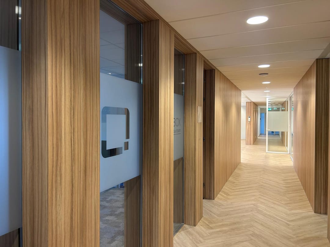 Zo is er veel gebruik gemaakt van glazen wanden en zijn er veel kleine werkruimtes gecreëerd in het midden van de ruimtes.