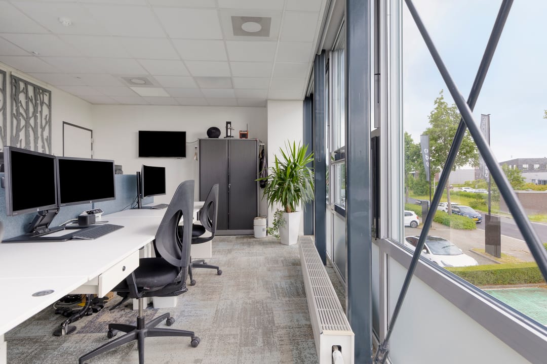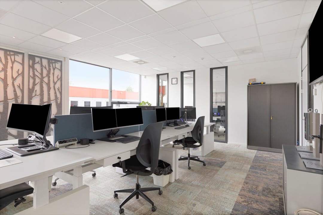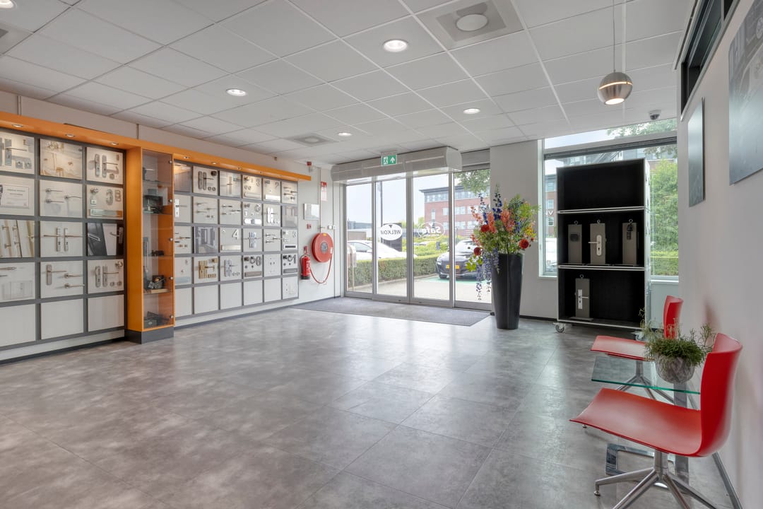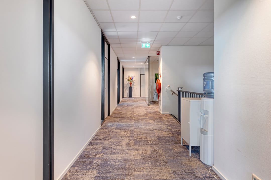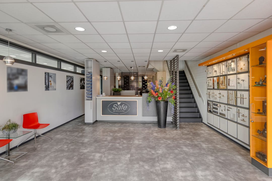 Ruime hal met opslagruimtes, toiletten en toegang tot 5 (voorheen 6, makkelijk weer te splitsen) keurige kantoorruimtes en de entresol van de bedrijfsruimte. Alle ruimtes zijn apart te verwarmen en ook de verlichting en screens zijn automatisch in te stellen en te bedienen.