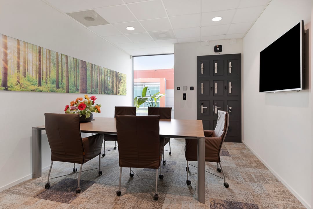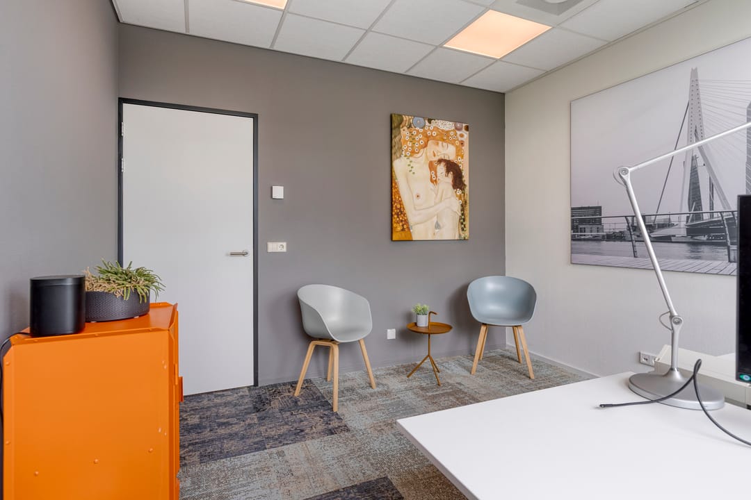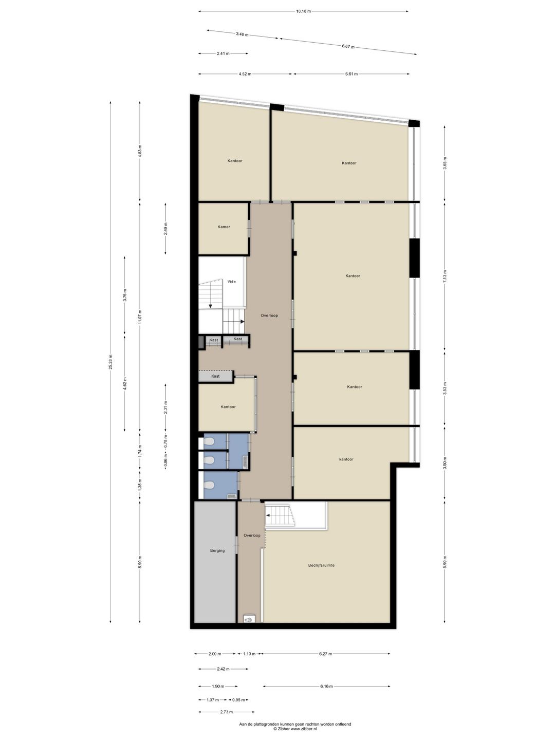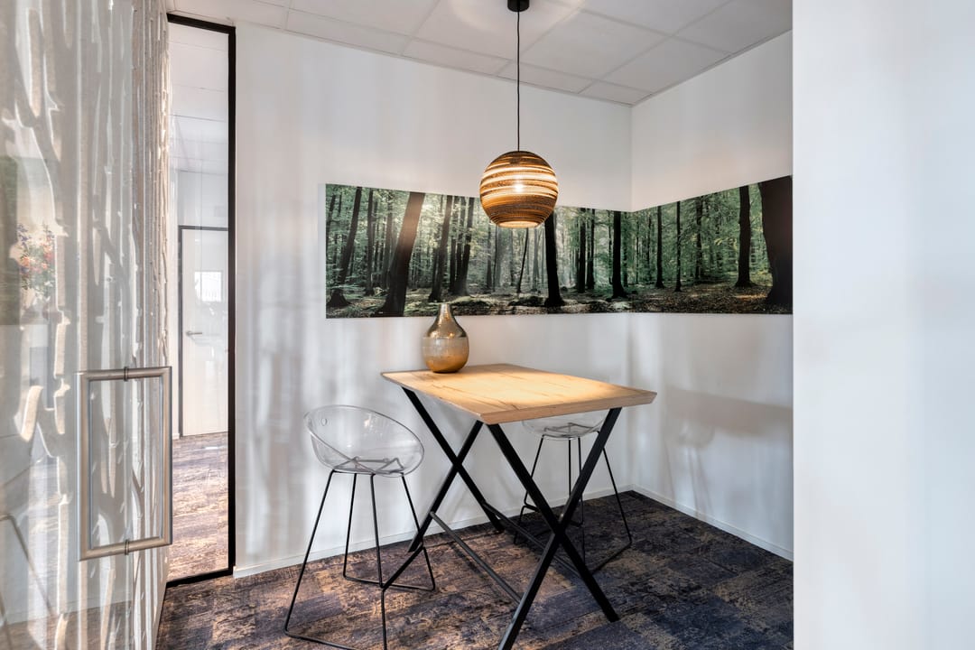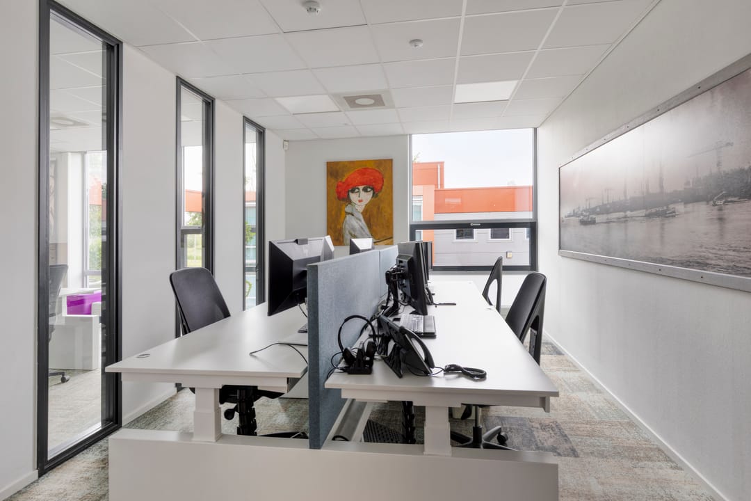 Ruime hal met opslagruimtes, toiletten en toegang tot 5 (voorheen 6, makkelijk weer te splitsen) keurige kantoorruimtes en de entresol van de bedrijfsruimte. Alle ruimtes zijn apart te verwarmen en ook de verlichting en screens zijn automatisch in te stellen en te bedienen.