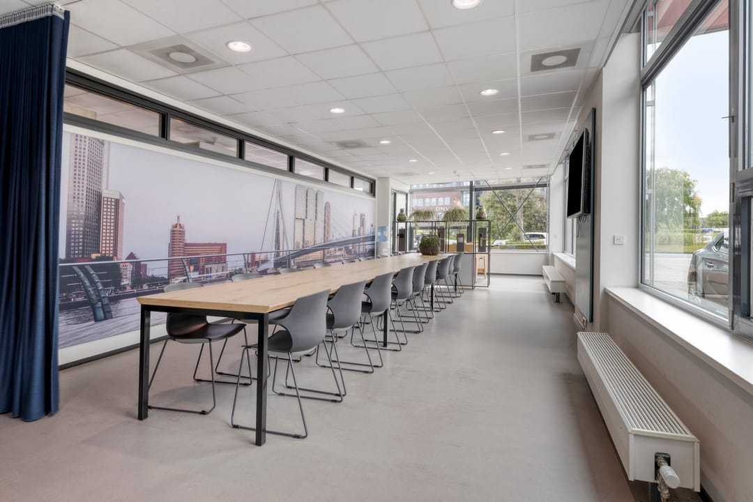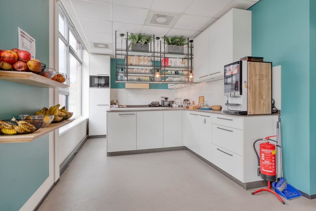 De sfeervolle kantine heeft veel lichtinval en een fraaie maatwerkkeukenopstelling met twee koelkasten, vriezer, vaatwasser (2024), Quooker, 4-pits inductiekookplaat en afzuigkap.
