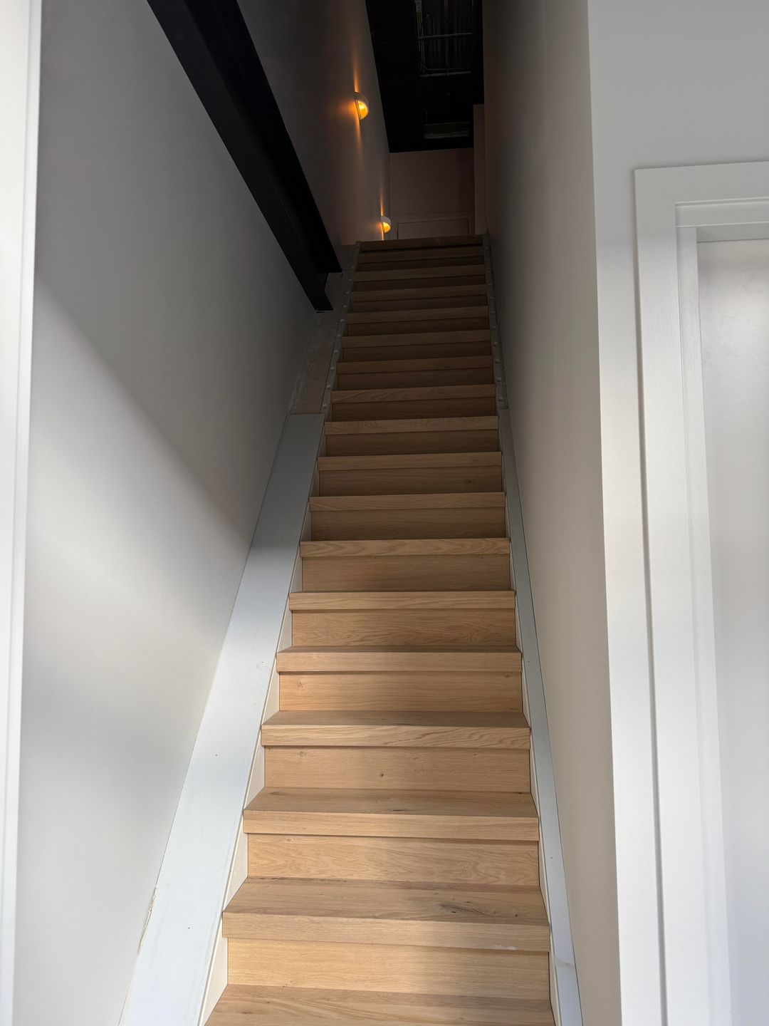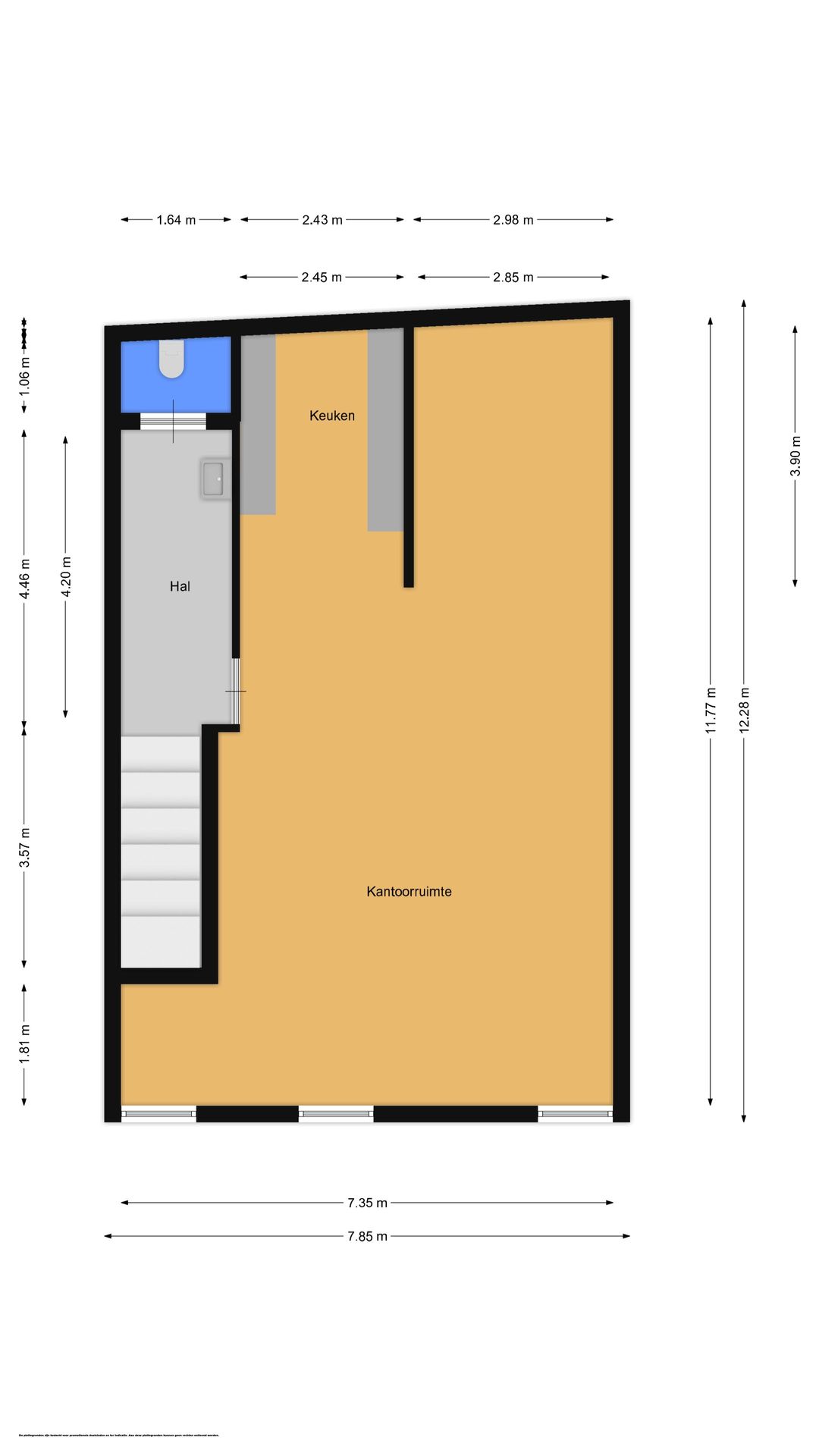 De verdieping bestaat uit een hal met trapopgang, een toilet en een keuken aan de achterzijde. Vanuit de hal loop je direct het kantoor in, dat bestaat uit één open werkruimte met veel lichtinval aan de voorzijde. De keuken ligt deels afgescheiden van de kantoorruimte.