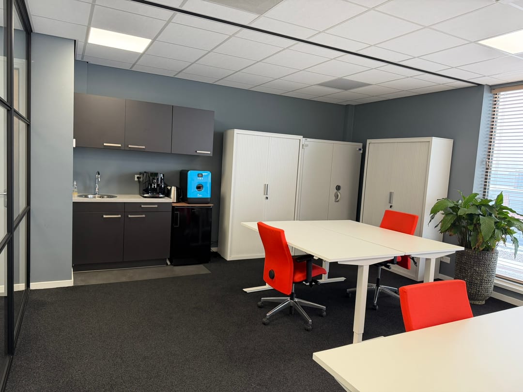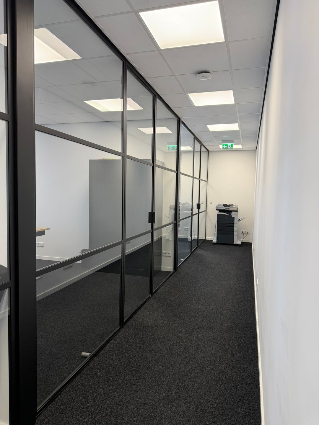 De kantoorruimte bestaat uit drie afgesloten kantoren die naast elkaar liggen en allemaal uitkomen op een centrale gang. Aan het einde van de gang zit het trappenhuis en een toiletruimte. In het rechterkantoor is een pantry geplaatst.