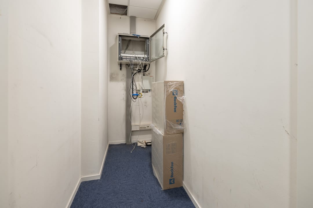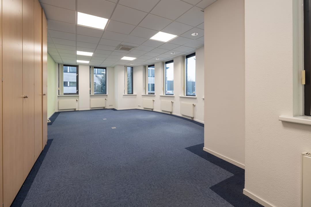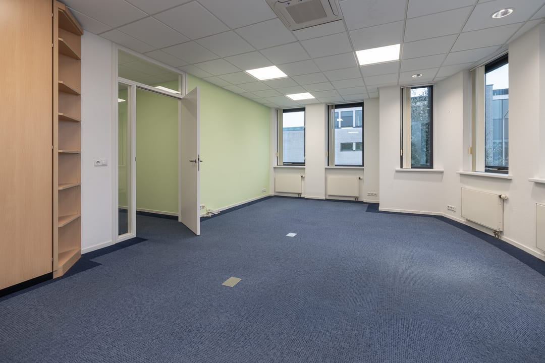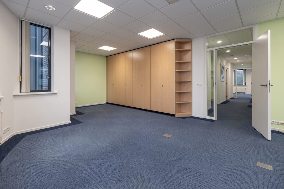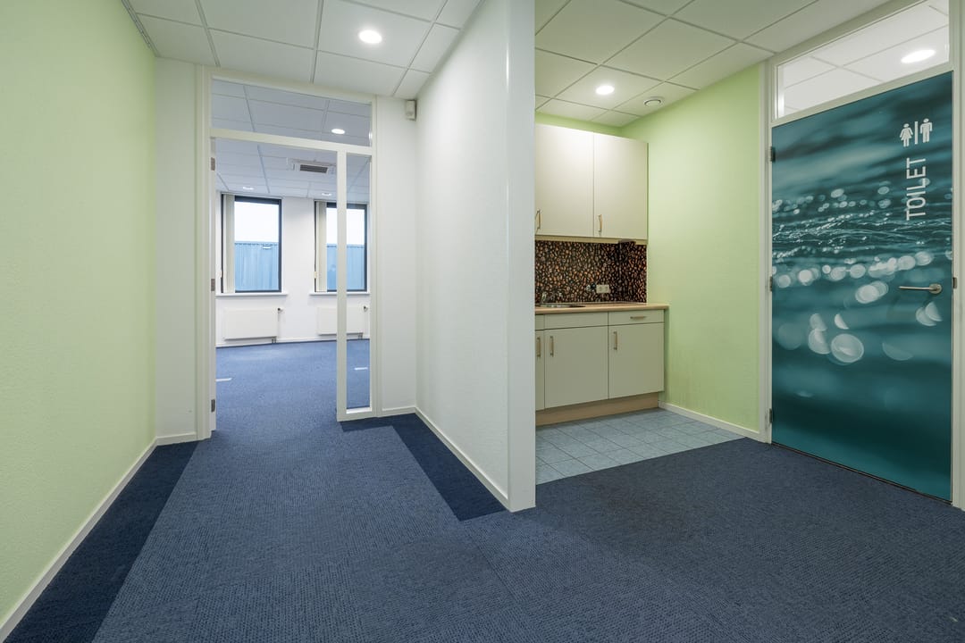 Via de toegangsdeur bij het trapportaal is de entree van het gehuurde te bereiken. In de entree loopt u direct tegen de pantry en garderobe aan, waar ook de toegang tot de toiletgroep te vinden is en tot de berg-en serverruimte. Vanuit de hal krijgt u ook nog toegang tot de drie kantoorruimtes.