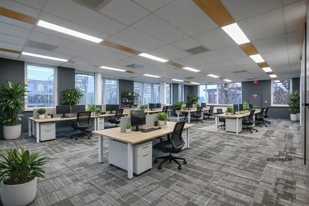- Topkoeling, te openen ramen, kabelgoten, systeemplafond, toilet, pantry, verwarming en kamerindeling
