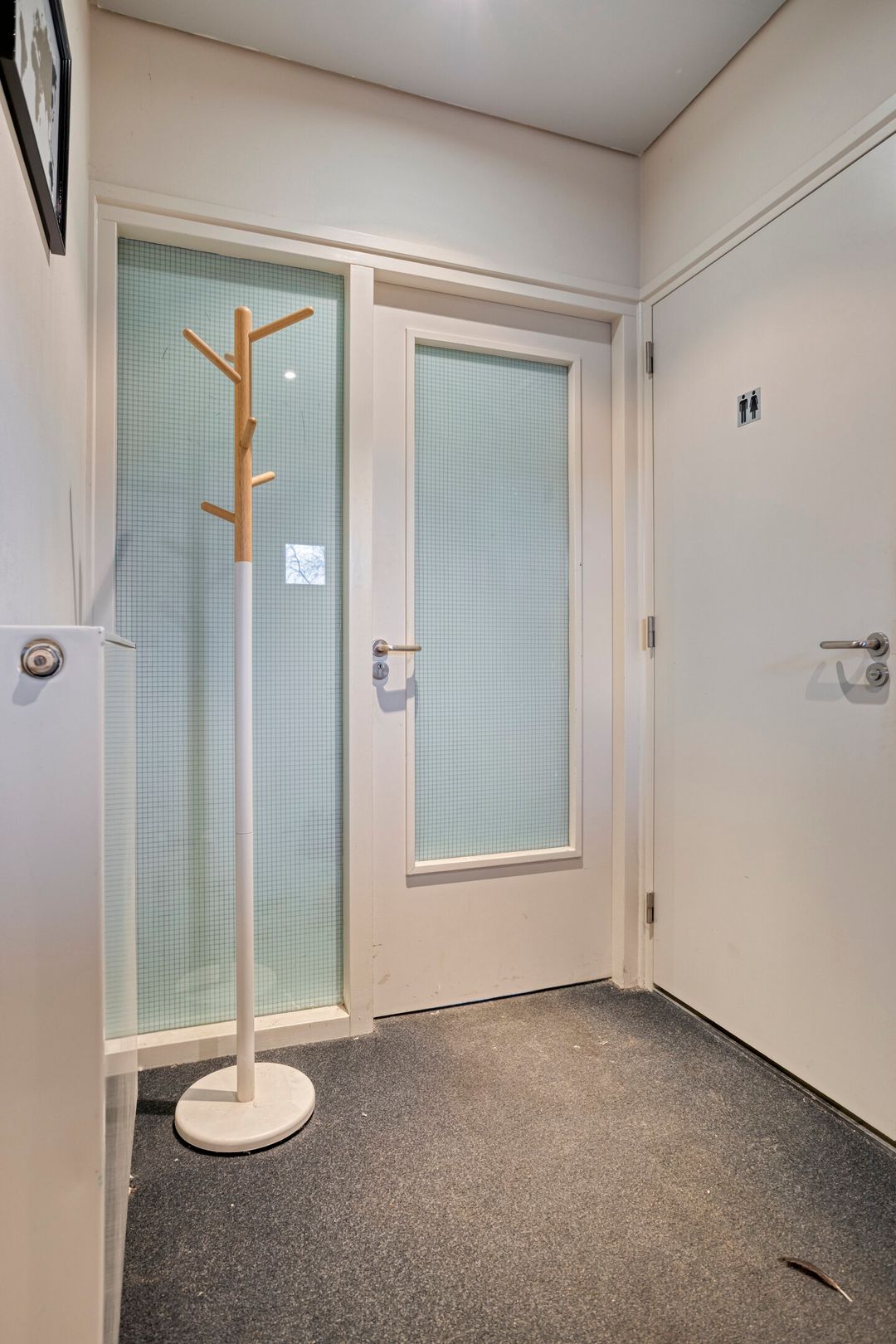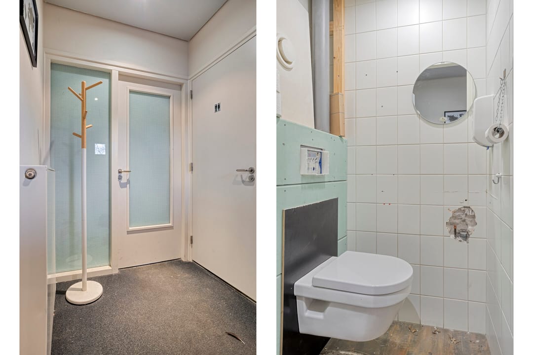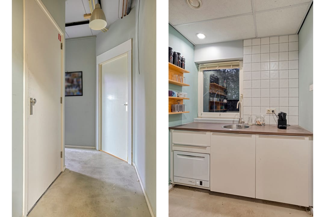 De entree geeft toegang tot een pantry met twee cv-ketels, een toilet en drie kantoren. Tevens eventueel te gebruiken als werkplaats. Op de eerste verdieping bevinden zich nog twee kantoren en separaat sanitair. Hier is een luxe eigen kookgelegenheid aanwezig, ideaal als eet-/personeelsruimte of workshopruimte. Mogelijkheden genoeg!