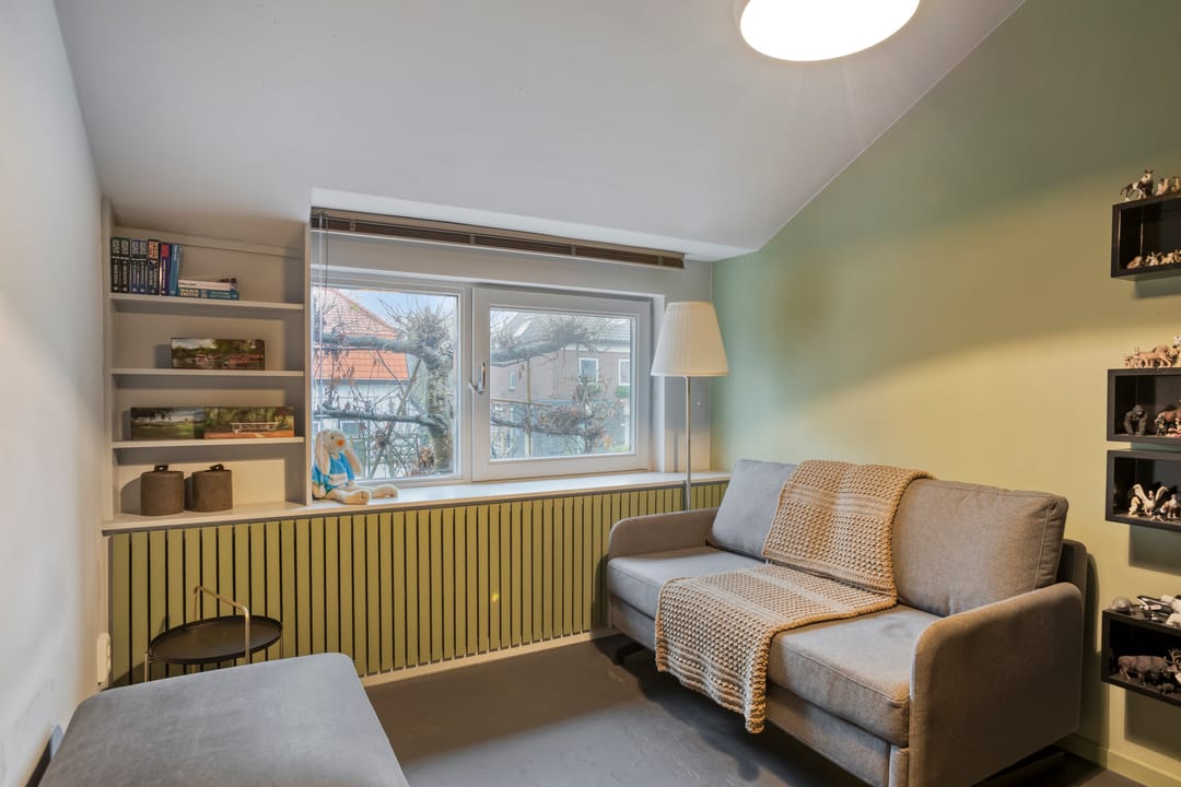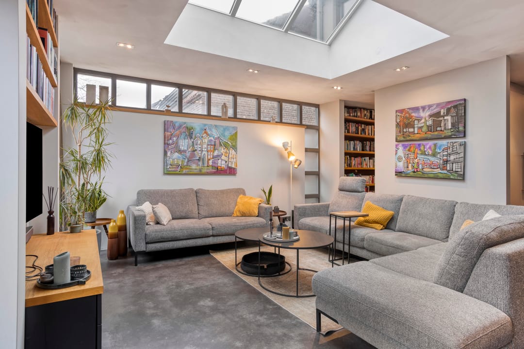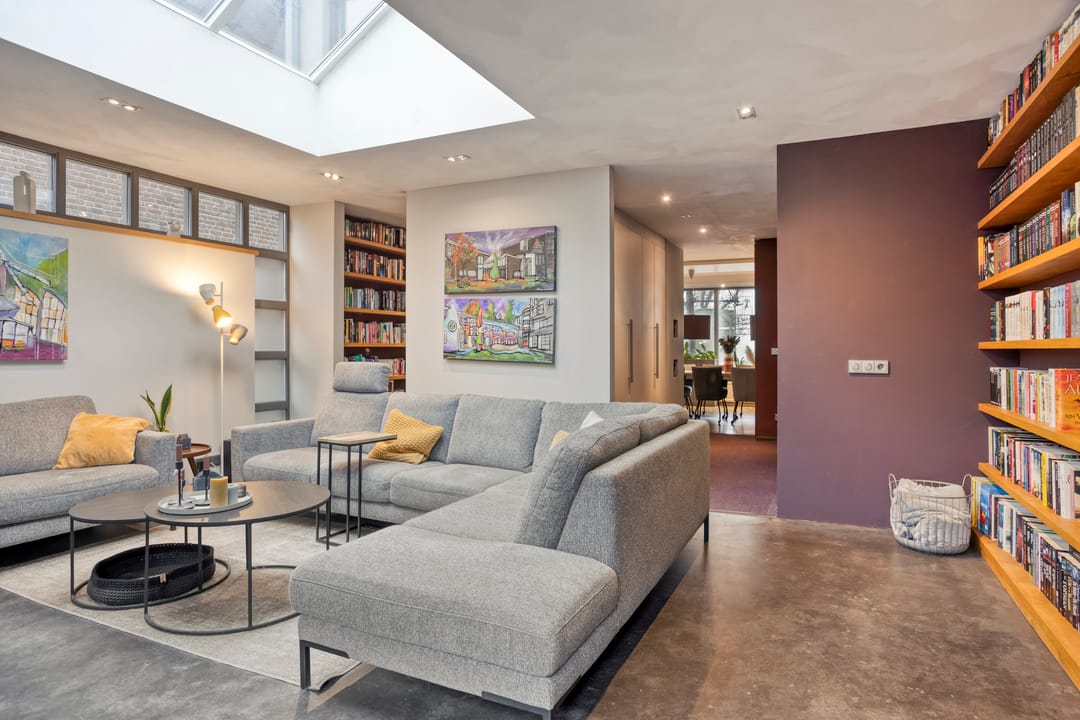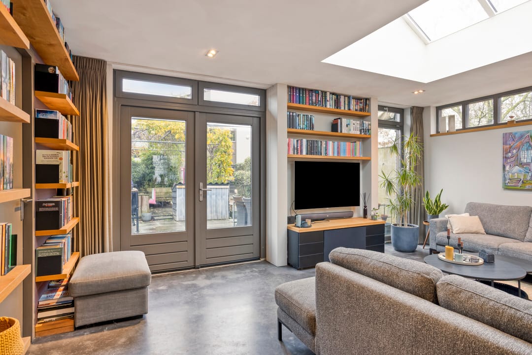 Aangrenzend ligt de living, voorzien van een heerlijke werk-/speelruimte, een lichtstraat en openslaande deuren naar de tuin. Dankzij vloerverwarming en grote raampartijen is dit een bijzonder lichte, comfortabele plek.