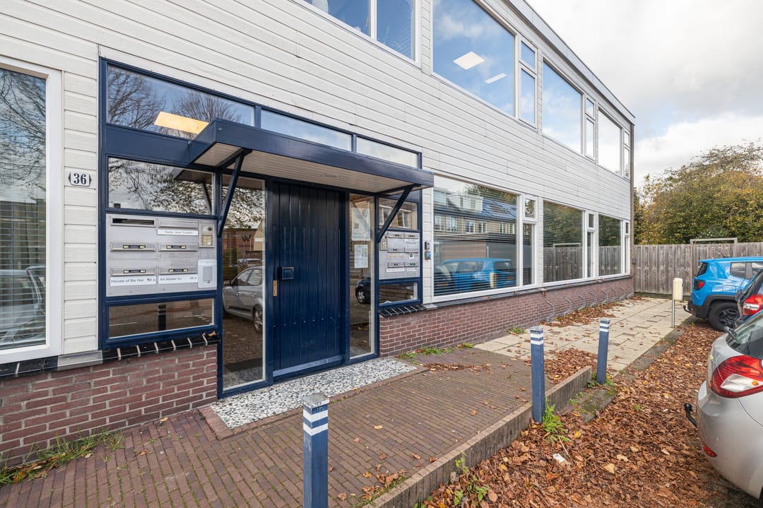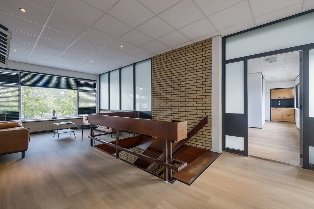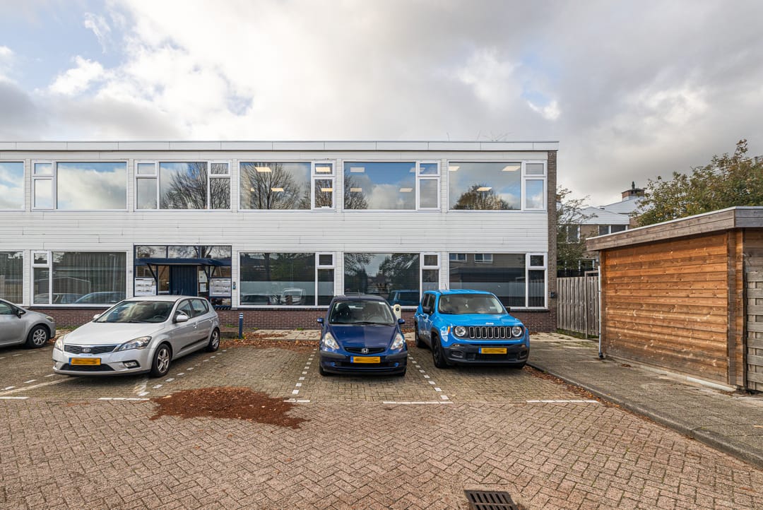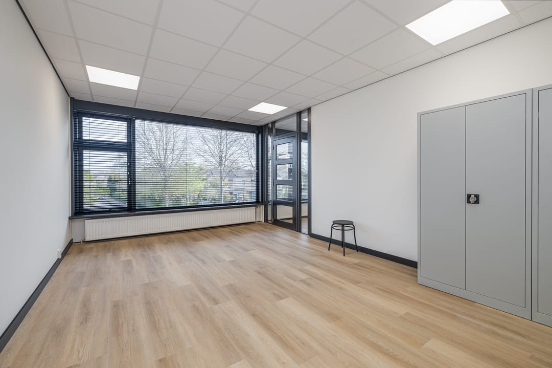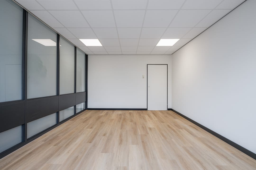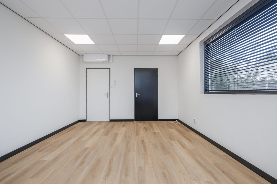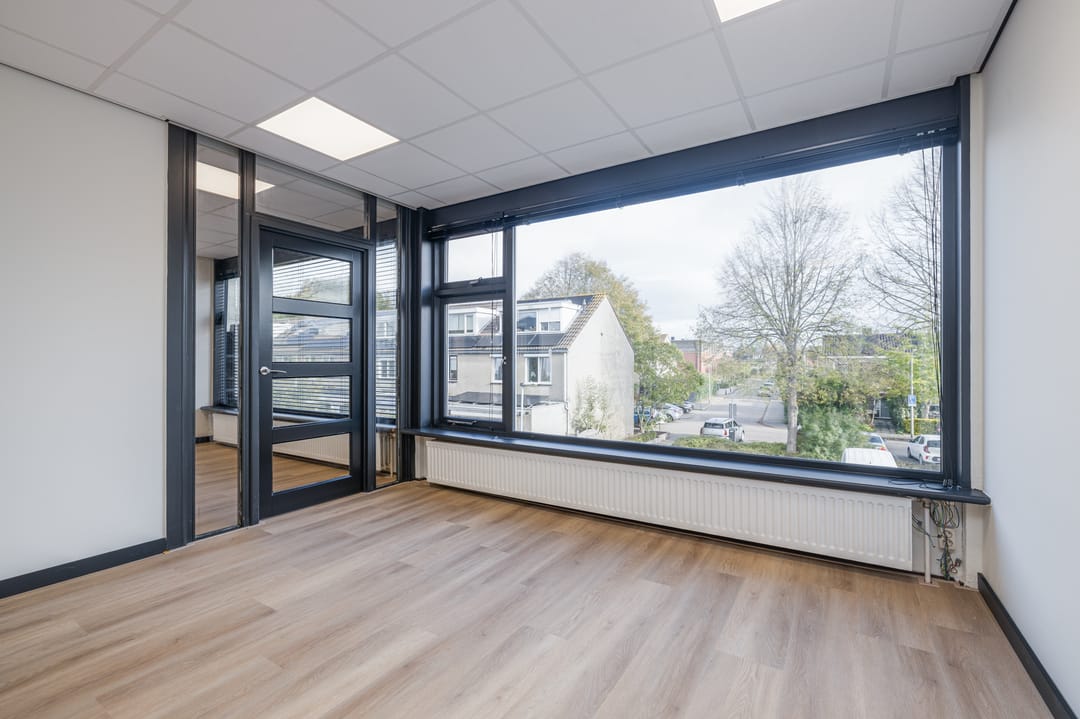 Een afgesloten kantoorruimte van ca. 21m2, gelegen op de hoek aan de voorzijde van het gebouw, uitkijkend op de parkeerplaatsen, aan de zijkant uitkijkend op de tuin van de buren, grote ramen met zwarte luxaflex, lichte PVC vloer en airco.
