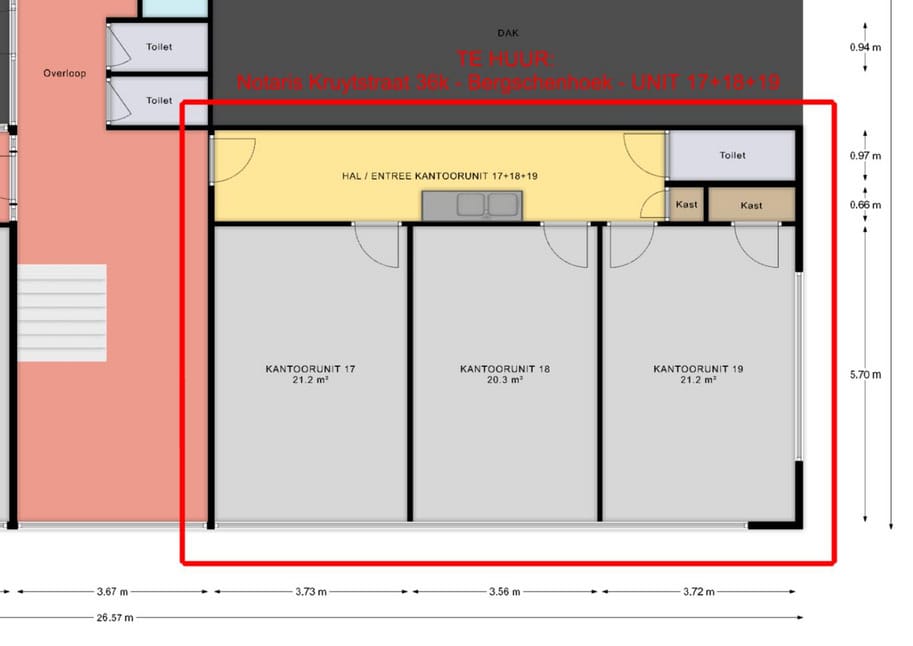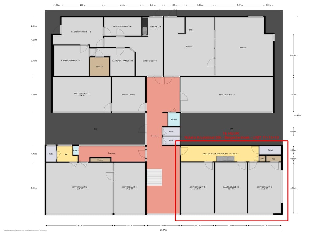 Deze kantoorvleugel met kantoorunit 17+18+19: € 975,- per maand, excl. BTW.