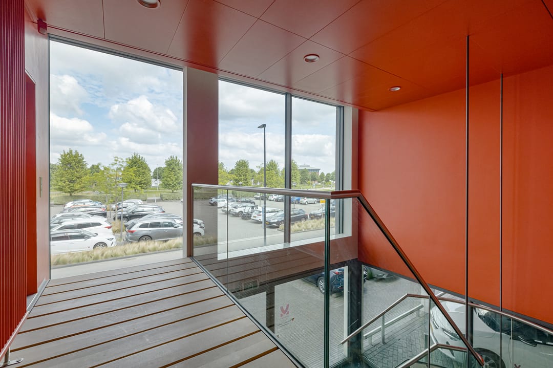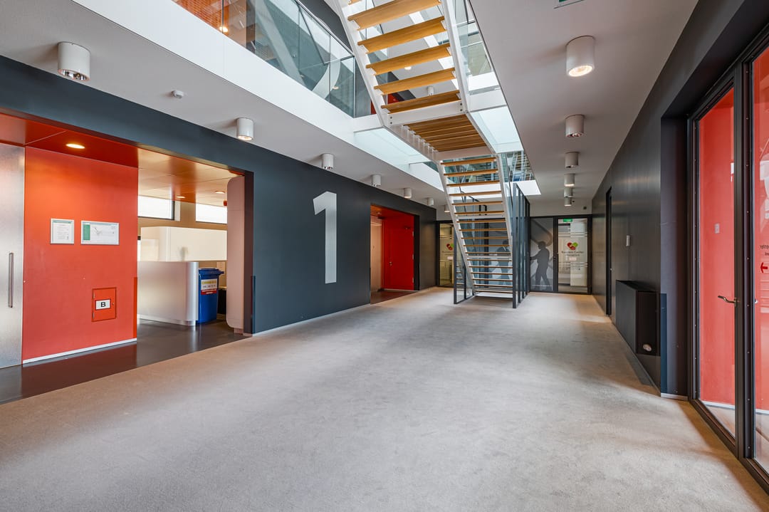 - Entree tot de kantoorvleugel met trap en lift naar de eerste etage.