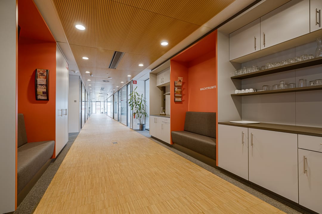 - Riante centrale ruimte met toegang tot de diverse kantoorunits, oa. ingericht met bankjes als wachtruimte voor bezoekers;