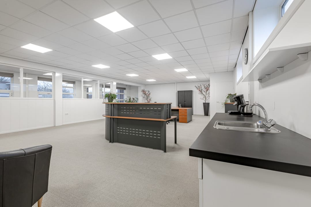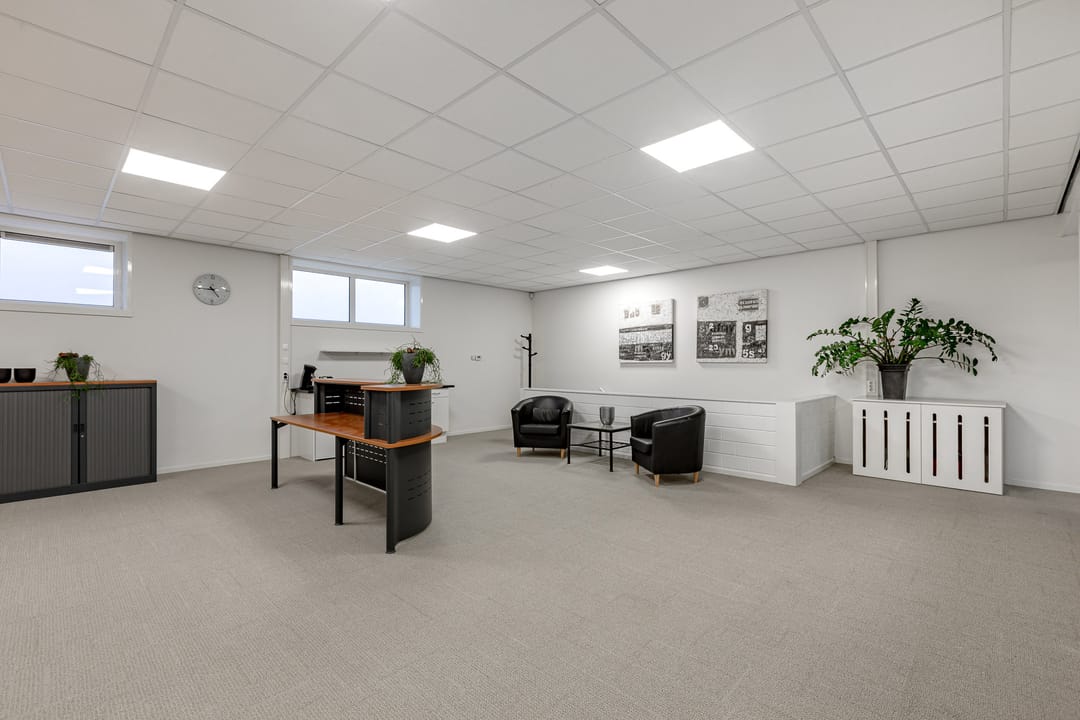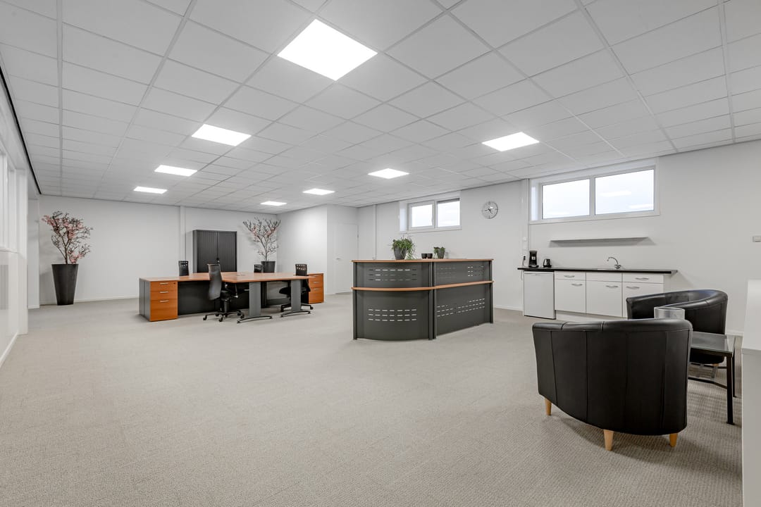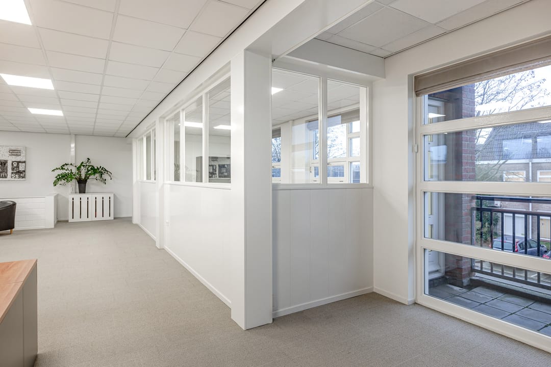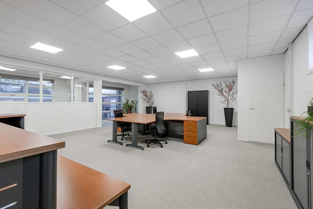 Kantoortuin welke is voorzien van vloerbedekking, stucwerk wanden en een systeemplafond met inbouwarmaturen (LED).