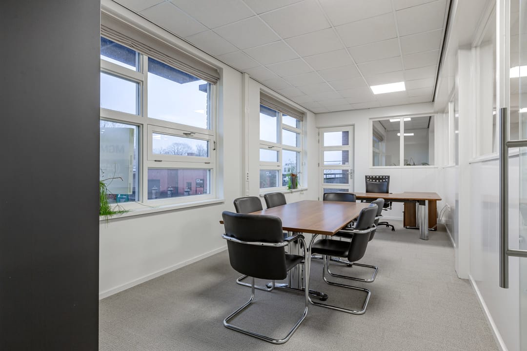 Werk-/spreekkamer welke is voorzien van vloerbedekking, stucwerk wanden en een systeemplafond met inbouwarmaturen (LED).