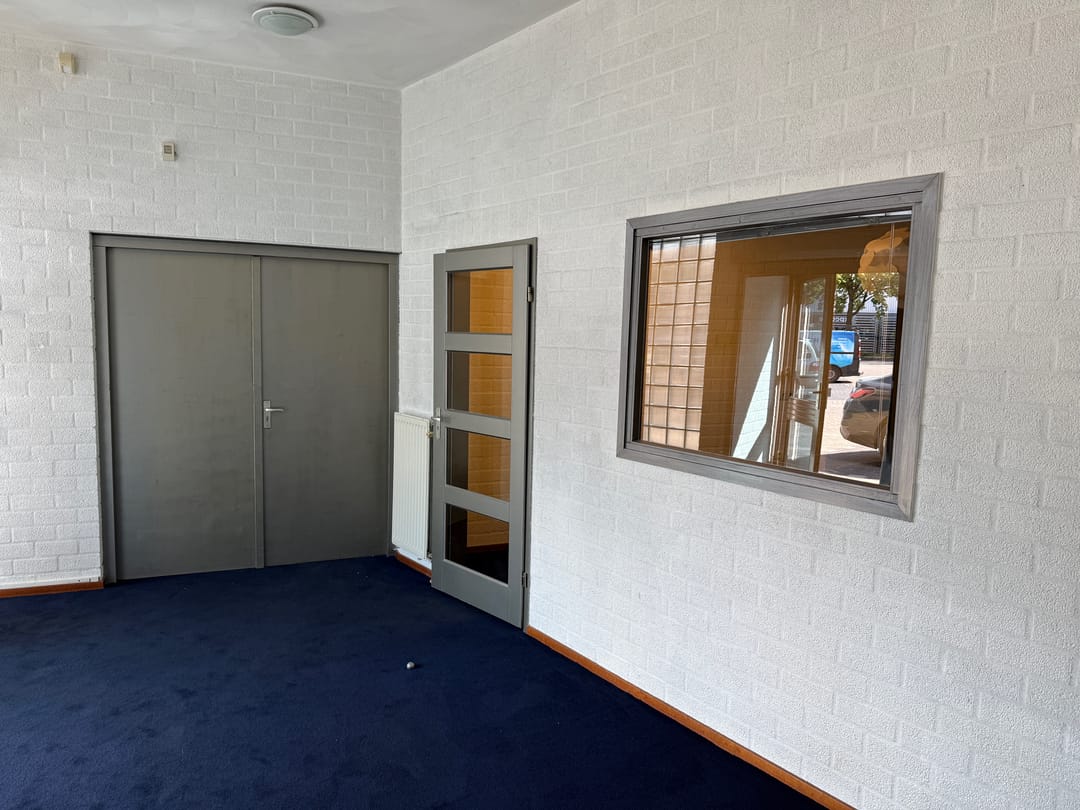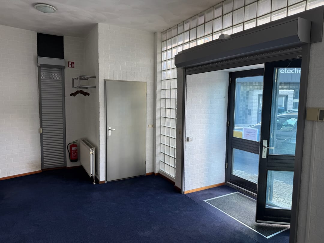 Entree via openslaande deuren (afsluitbaar met rolluik). Ontvangsthal. Toiletruimte. Kantoor annex kantine met pantry en trapkast.