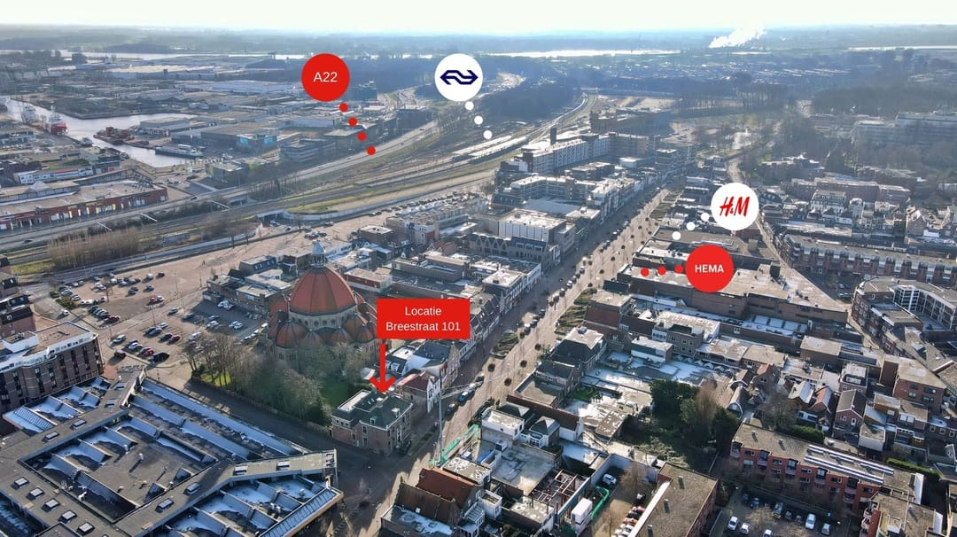 Gelegen aan de Breestraat in het centrum van Beverwijk, provincie Noord-Holland. De locatie bevindt zich op loopafstand van het treinstation en nabij winkels en overige voorzieningen. De bereikbaarheid per auto is goed via de A9 en A22.