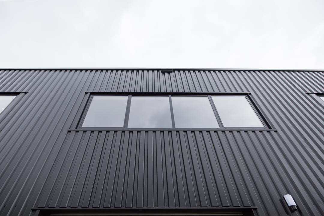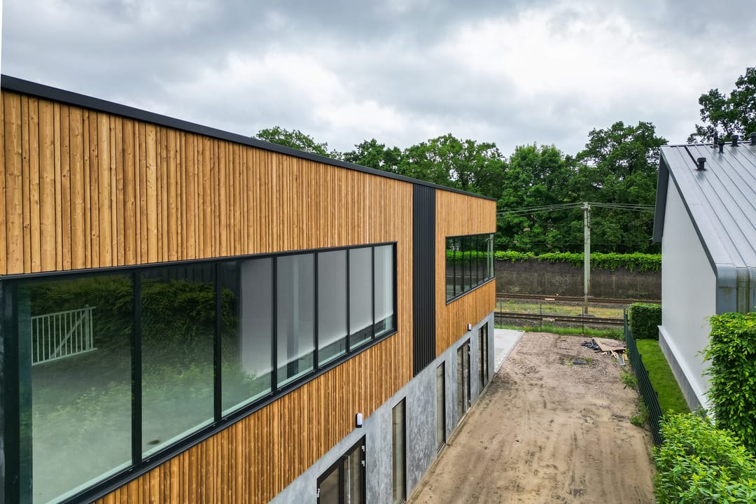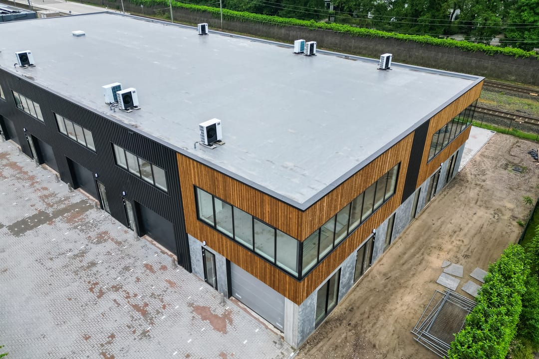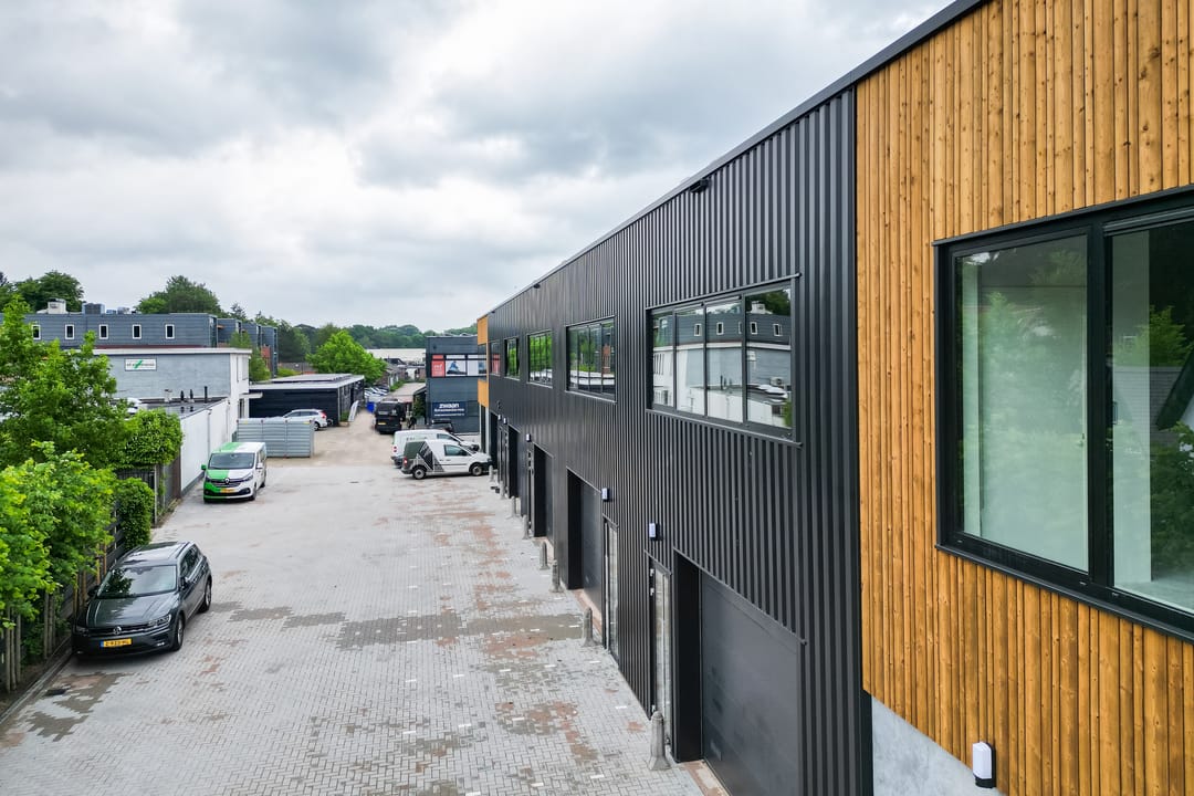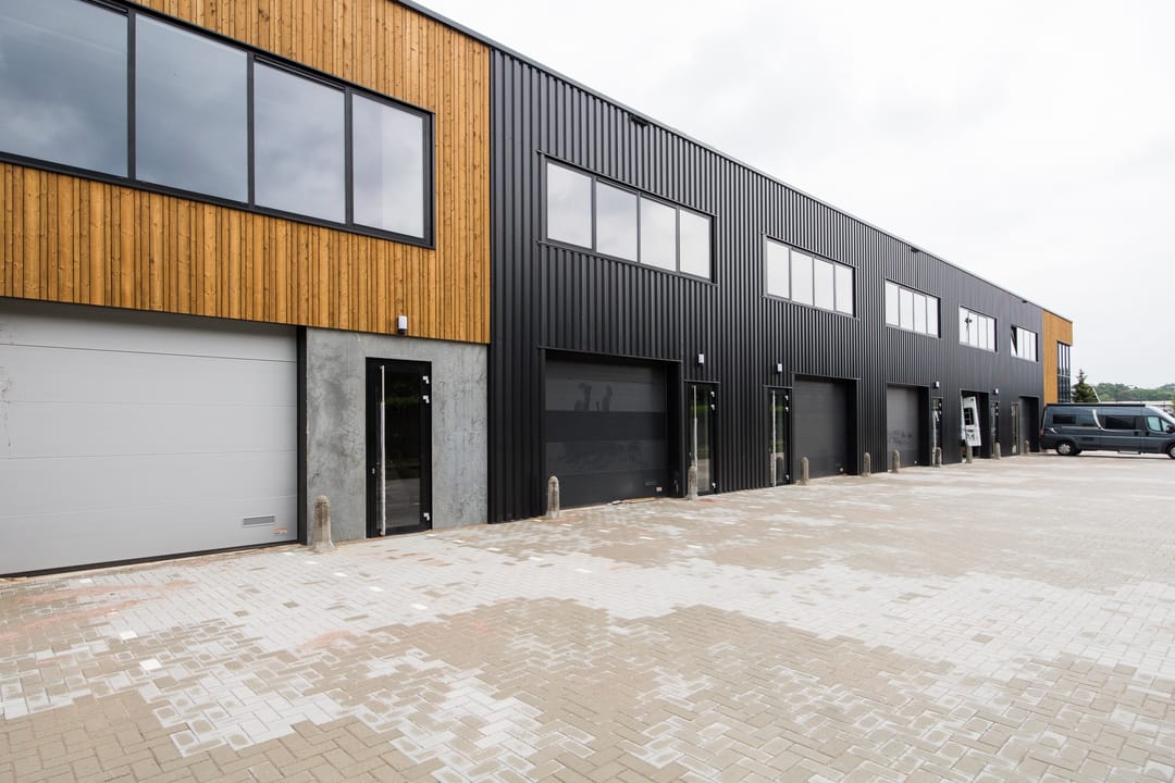 Deze bedrijfsunits hebben een strakke, moderne uitstraling dankzij de combinatie van hout, beton en glas.