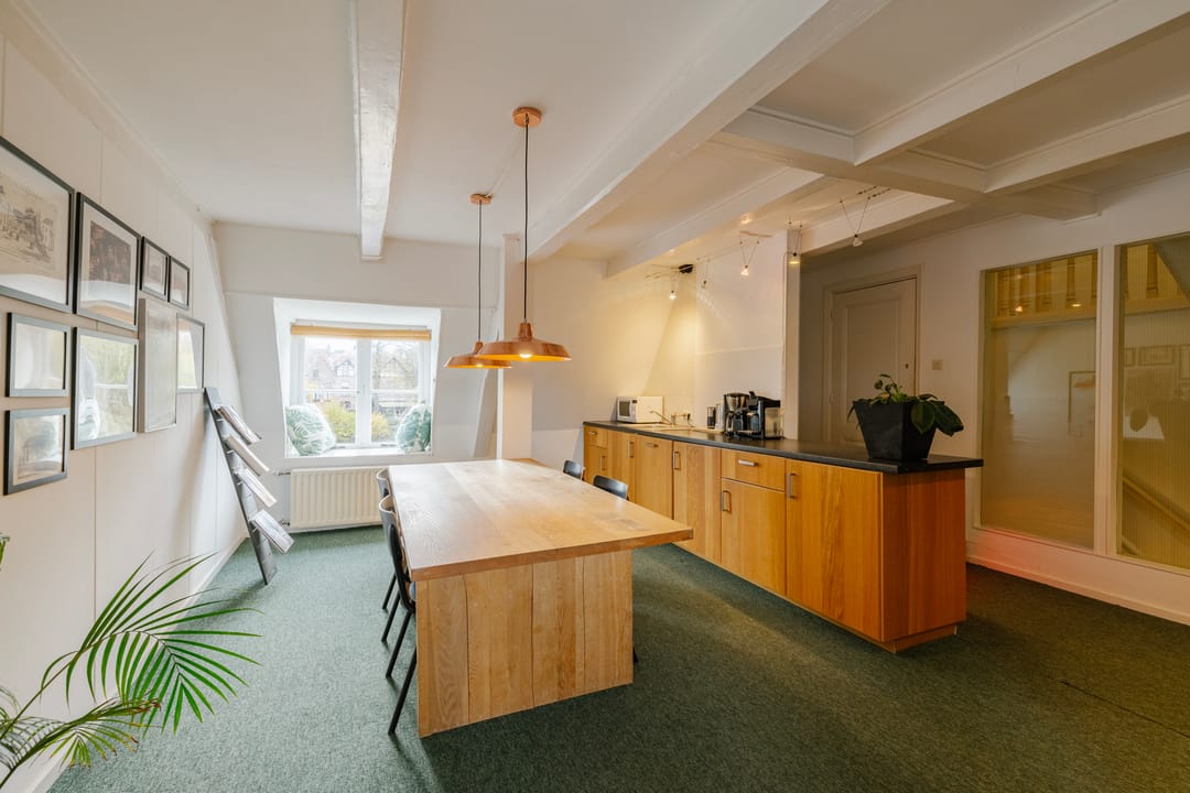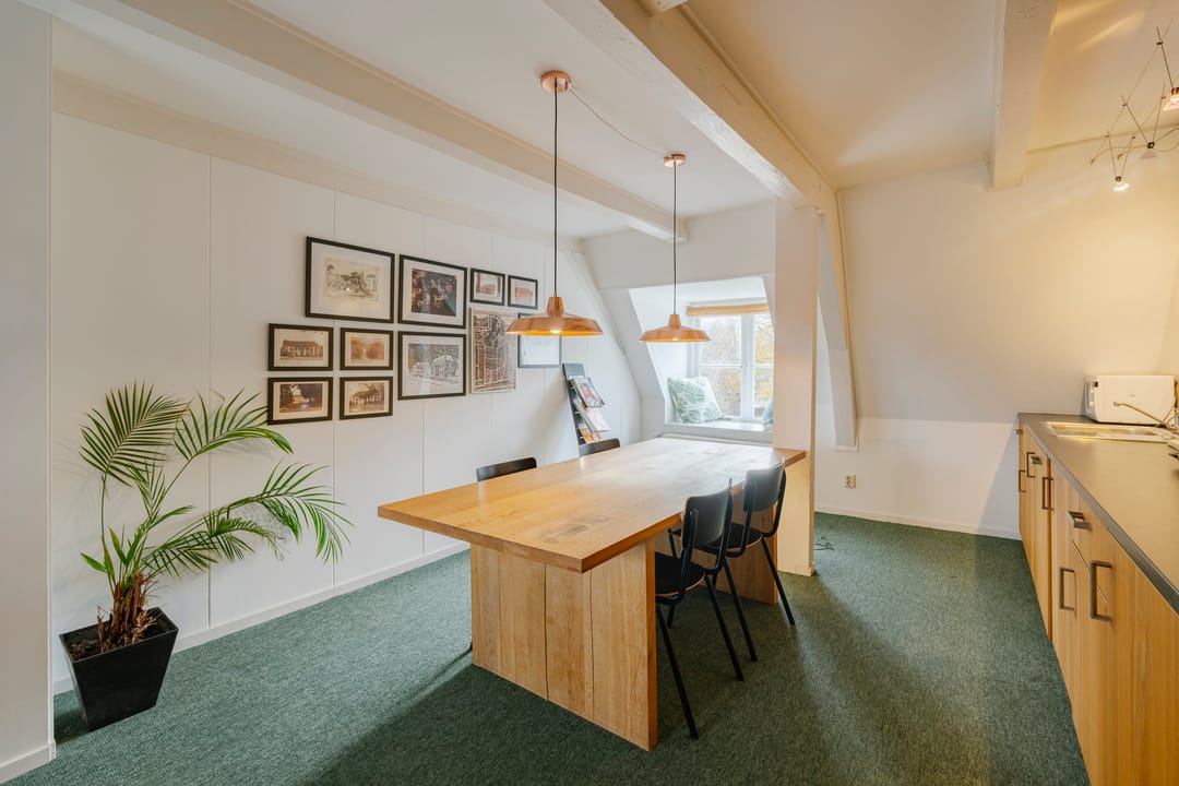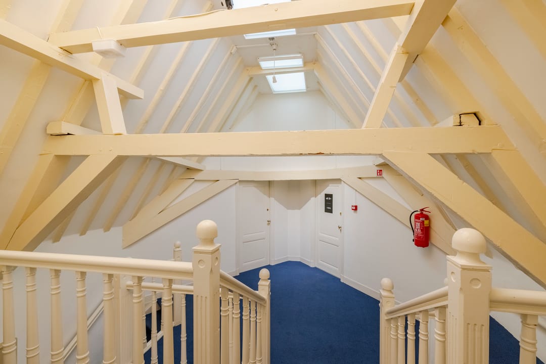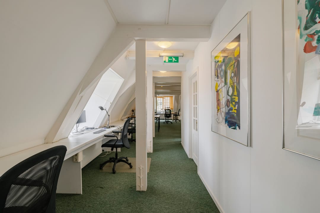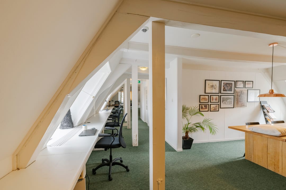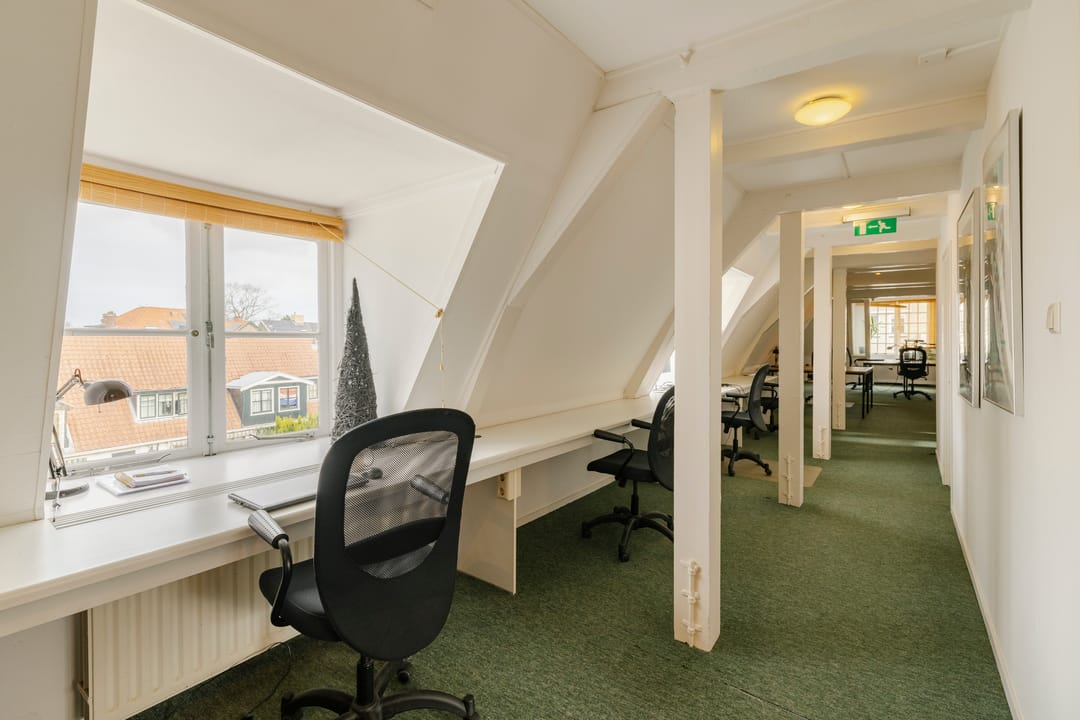 - Het betreft een kantoorruimte van ca. 169 m² VVO en is gelegen op de tweede verdieping. De ruimte beschikt over een keuken, meerdere spreekkamers en een open kantoorindeling. Dankzij de sfeervolle dakkapellen komt er veel natuurlijk licht binnen en biedt de ruimte een mooi uitzicht. Het sanitair wordt gedeeld met andere huurders.