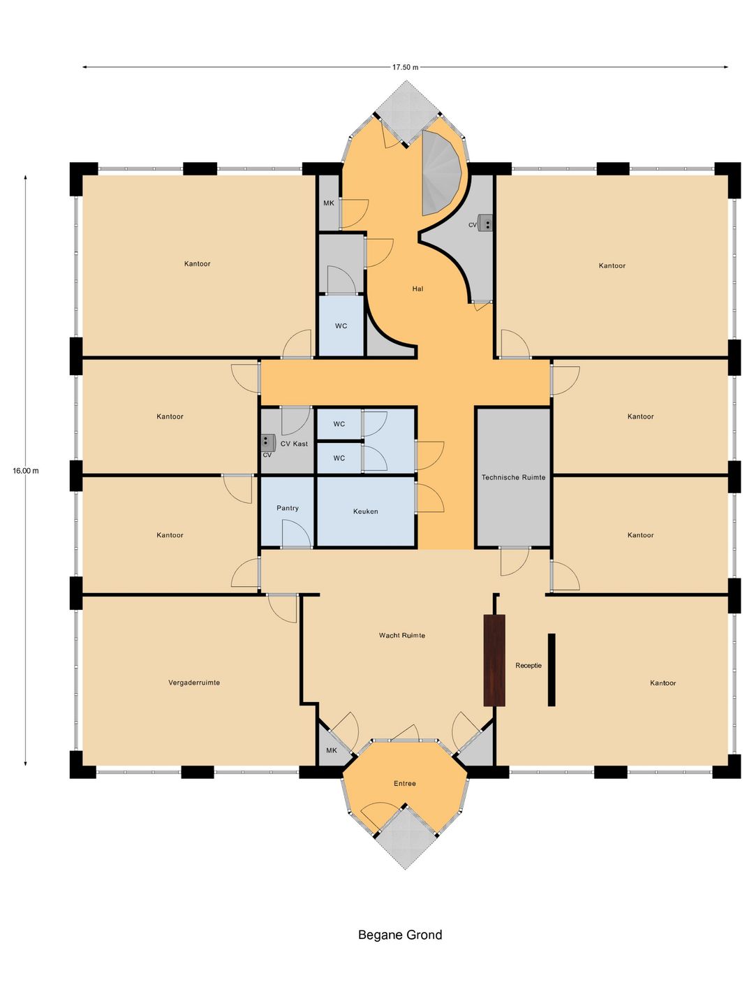 Het kantoor is thans in gebruik als single-tenant en beschikt op de begane grond over een entree met ontvangst-/wachtruimte, acht kantoorruimtes, gescheiden toiletruimtes, pantry, archief en technische ruimte.