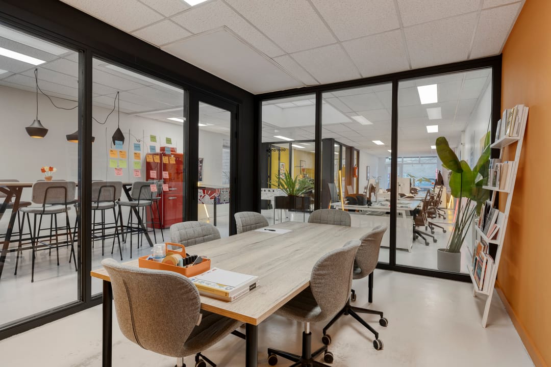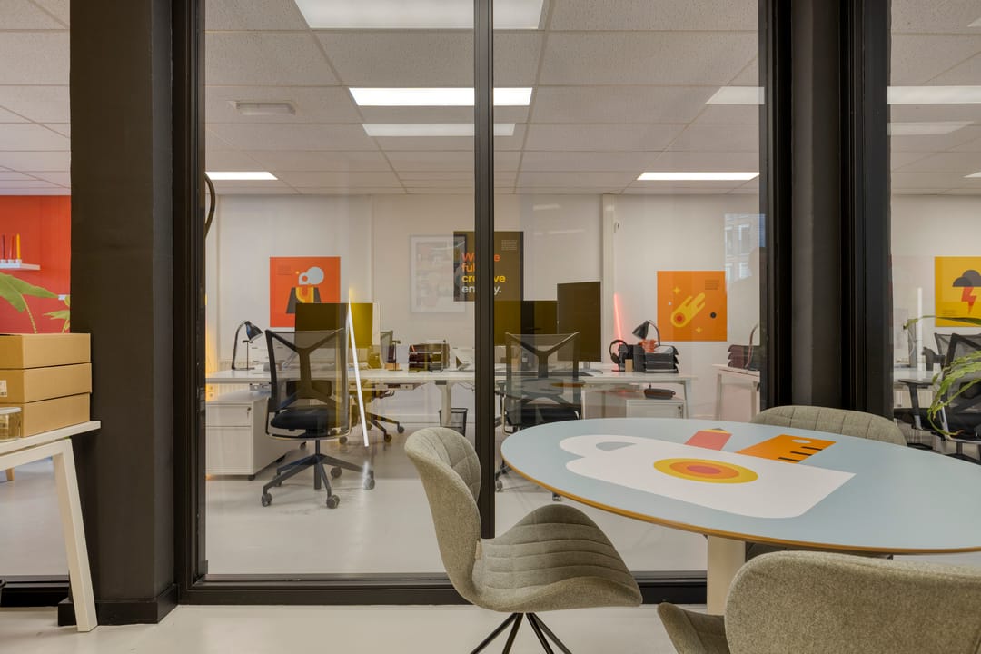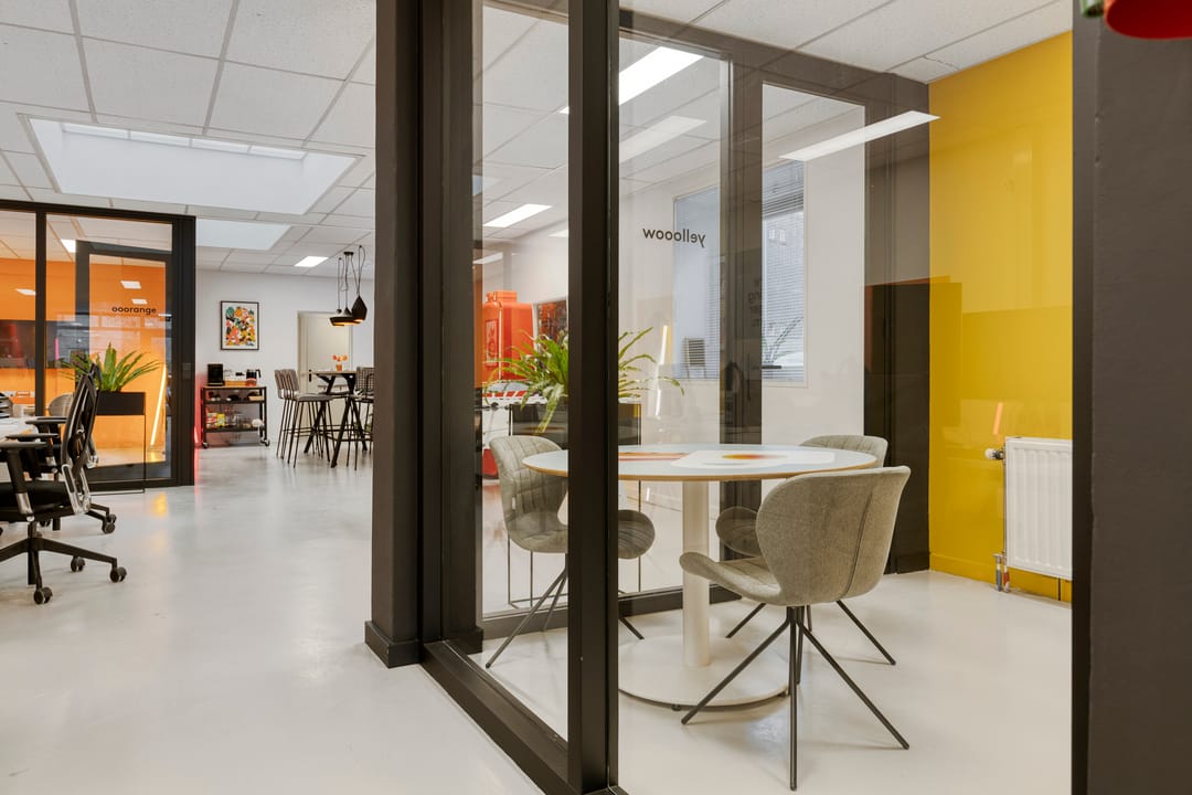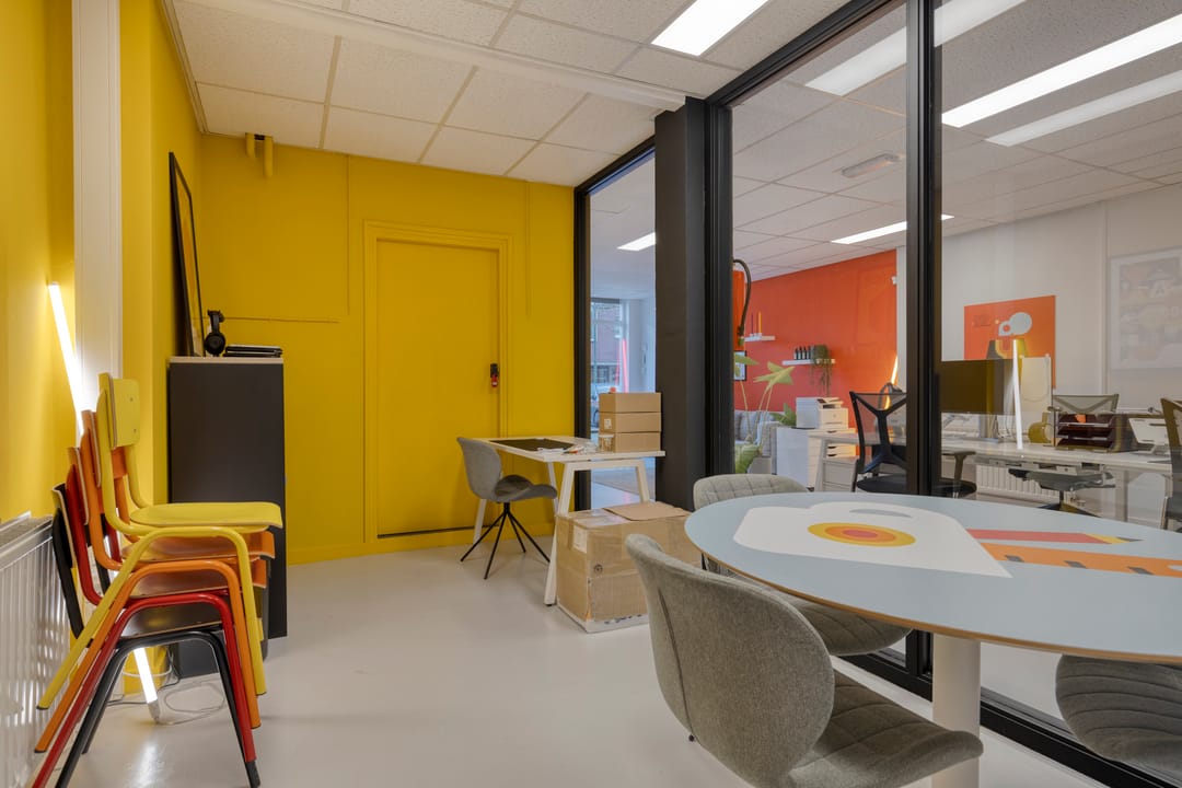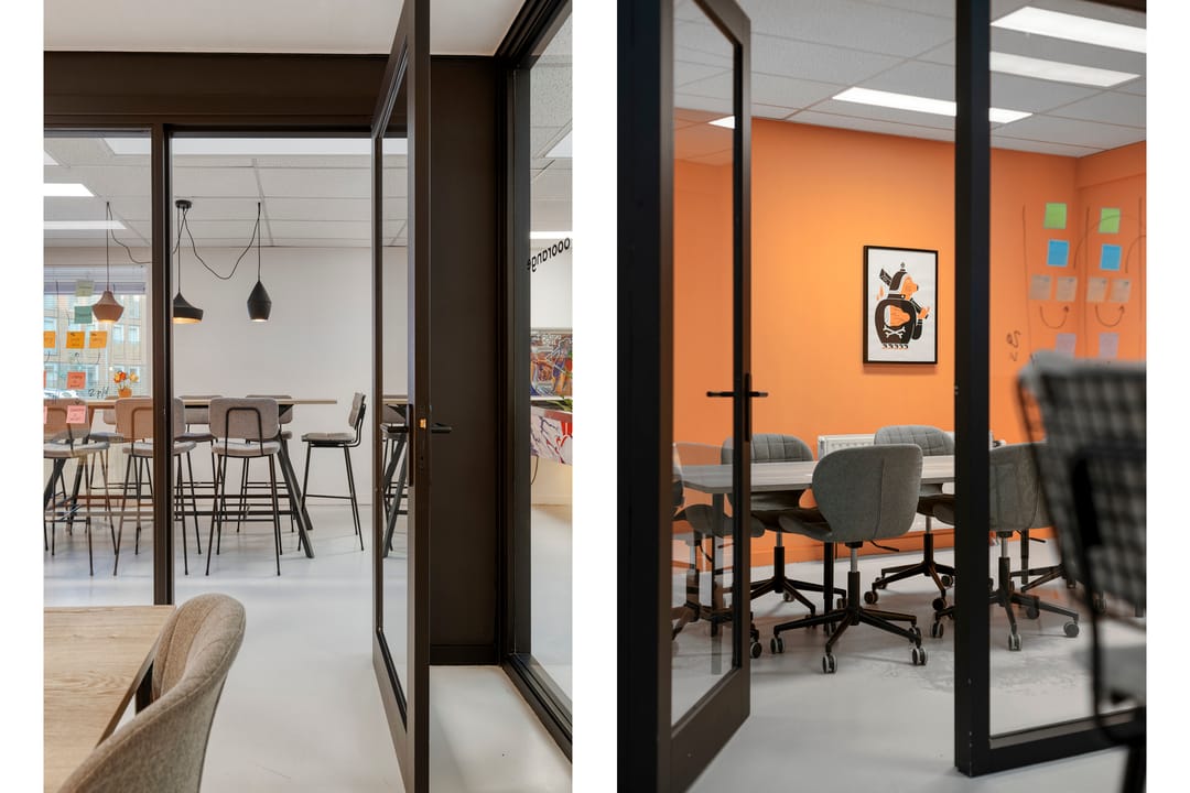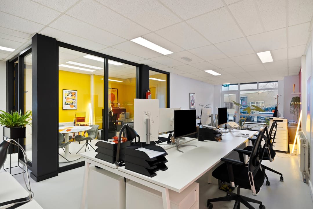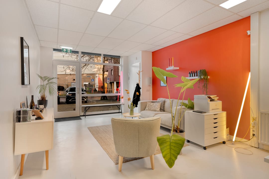 Vanuit de entree is er een directe inloop in het kantoor. Het geheel is opgedeeld in een open kantoorruimte met zowel aan de voor- als de achterzijde een spreekkamer voorzien van glazen wanden. Aan de achterzijde bevinden zich de sanitaire groep, pantry en magazijnruimte. Het geheel is onlangs volledig gerenoveerd en heeft een lichte en frisse uitstraling.