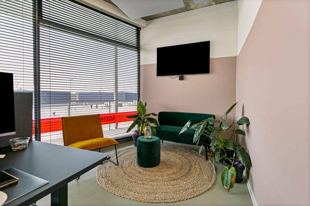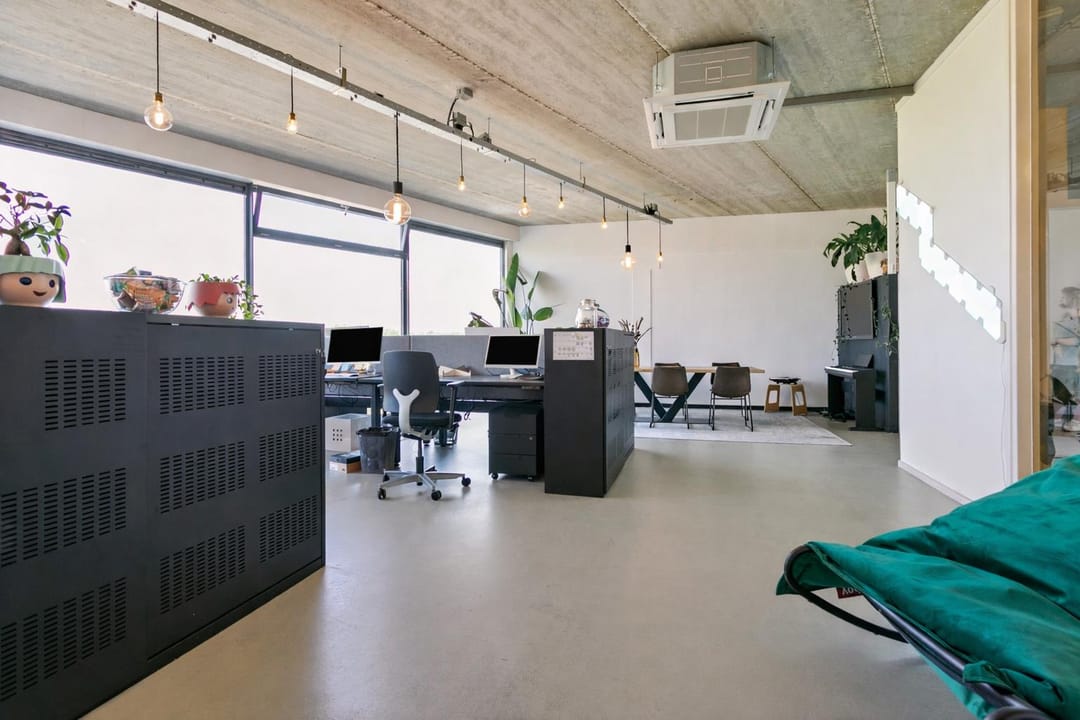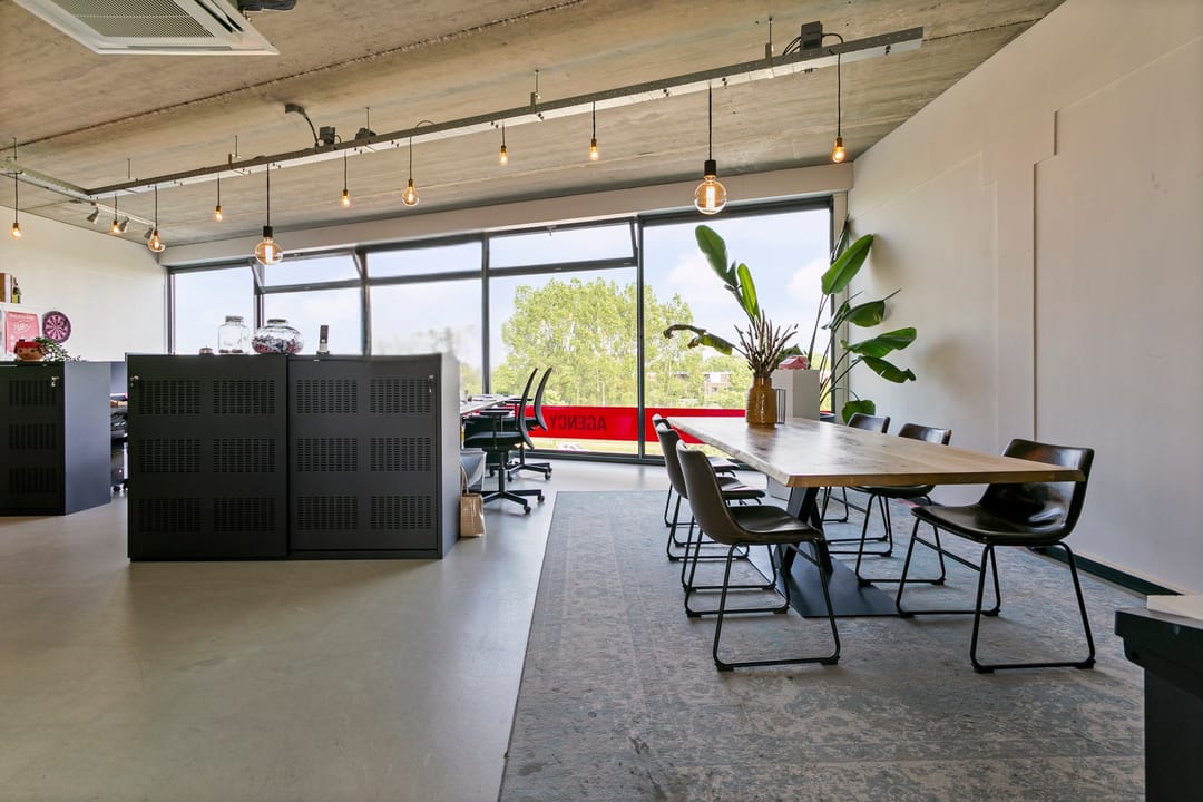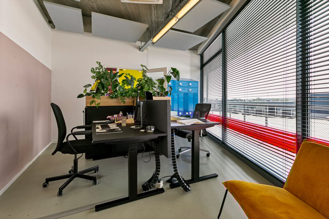 De voor- en achtergevel bestaan geheel uit glas en bieden hierdoor een riant uitzicht. Door de huidige gebruiker is de unit afgewerkt met een industriële look en door middel van scheidingswanden is een courante indeling ontstaan met een groot kantoor aan de voorzijde, twee kantoorkamers, toilet en een pantry.