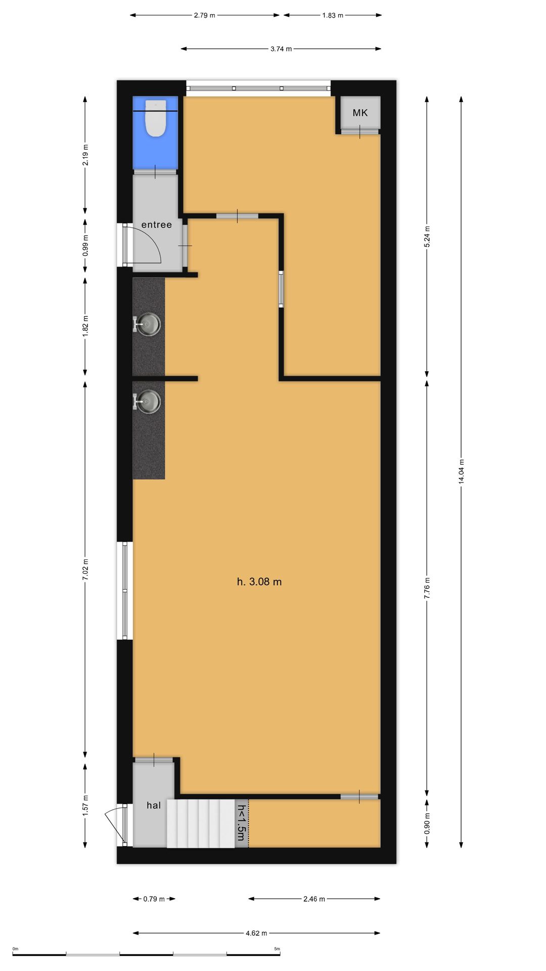 De begane grond van circa. 60 m² VVO beschikt over een ruim en licht klaslokaal met pantry en een plafondhoogte van circa 3,08 meter, een tweede kamer en een vast toilet.