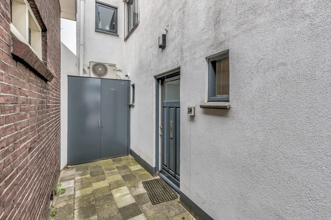 Eigen entree aan de zijkant van het pand. Deze zal zal nog worden verfraaid met beplanting. In de hal is een trapopgang naar de eerste etage.