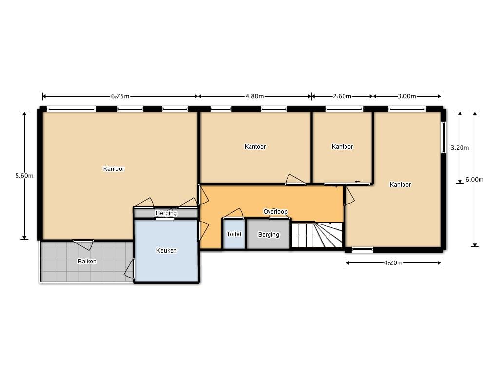 De verdieping bestaat uit vier kantoorruimtes van 8, 15, 20 en 40m2.