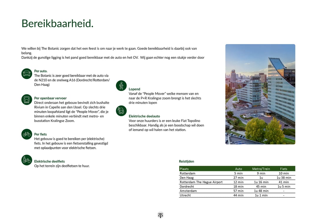 The Botanic is uitstekend ontsloten via de N210 en de snelweg A16 richting Rotterdam, Dordrecht en Den Haag. De locatie beschikt over een afgesloten parkeergarage onder het gebouw, wat zorgt voor veilig en comfortabel parkeren voor medewerkers en bezoekers.