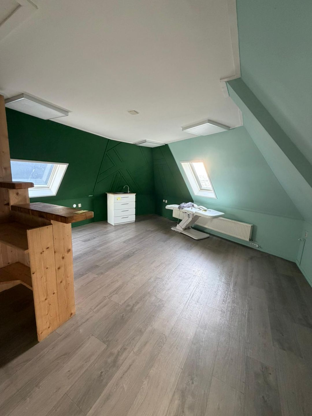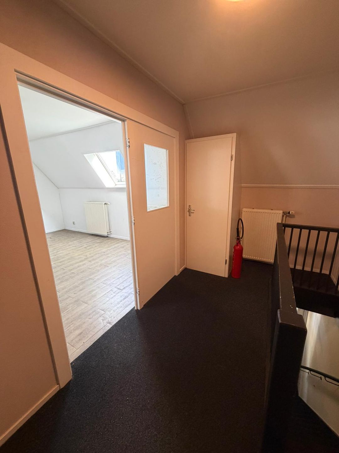 Eerste verdieping: Overloop met bergruimte. Ruime praktijkruimte met balie en vaste kast. Eventueel nog een praktijk/wachtruimte.
