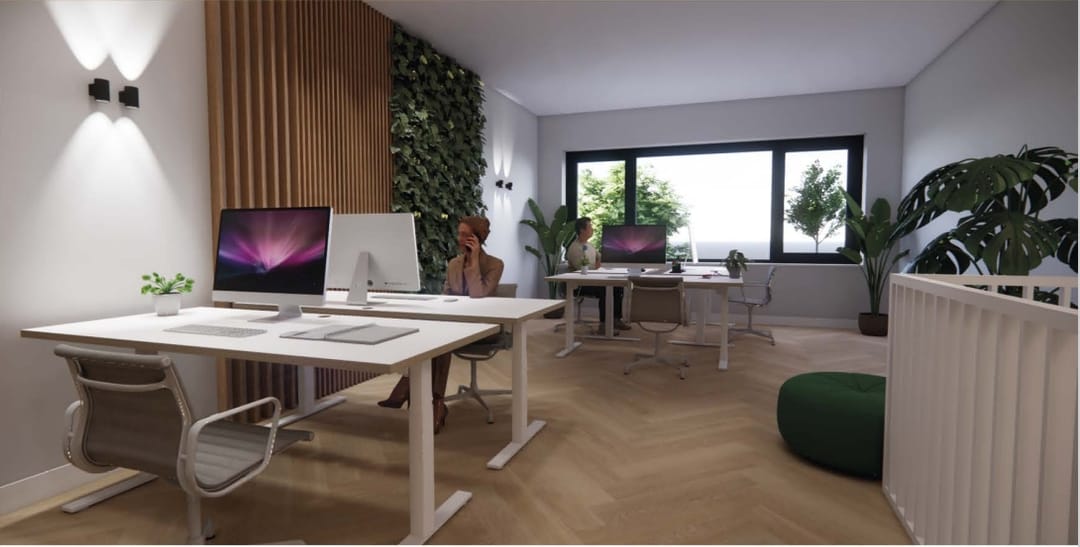 Het complex is duurzaam en energiezuinig ontworpen, passend bij de moderne eisen van een hedendaags kantoor. Vier eigen parkeerplaatsen zijn inbegrepen bij de huur van twee units, en er wordt een elektrische laadpaal geplaatst voor gebruik door huurders.