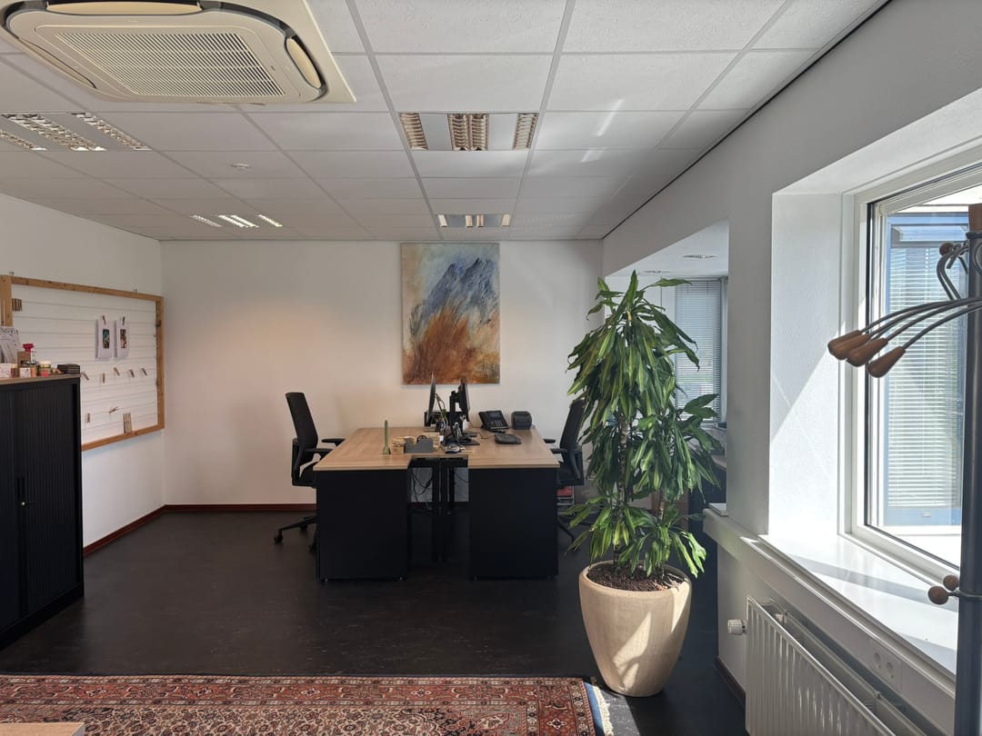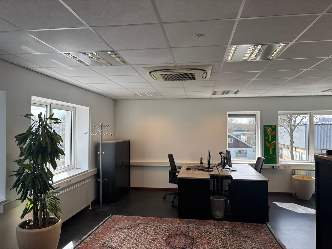 * De kantoorruimten bevinden zich op de 1e verdieping van het gebouw en zijn voorzien van systeemplafond, linoleumvloer, centrale verwarming, kabelgoten met bekabeld Internet en airco installatie.