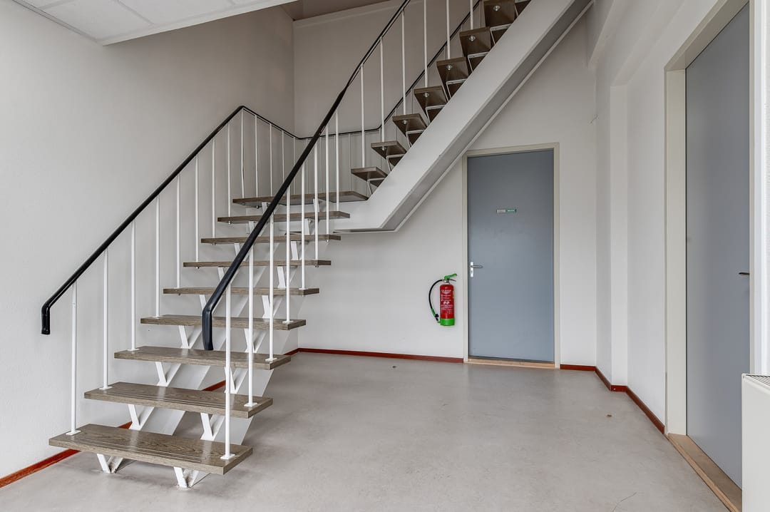 Gezamenlijke entree aan de zijde Beesdseweg, hal met trap naar de 1e verdieping. Aan de voorzijde van het gebouw en direct naast de trap bevindt zich het aangeboden kantoor.