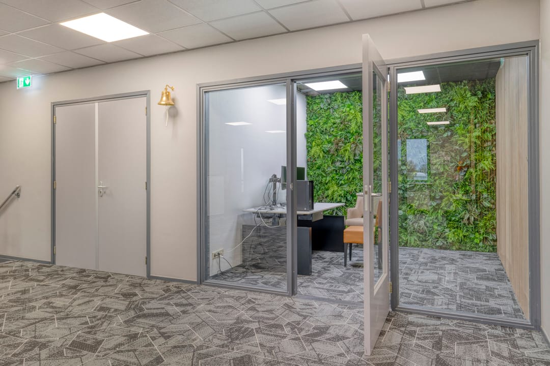 • Moderne spreekkamer op de verdieping voorzien van glazen wand (tafel is ter overname).