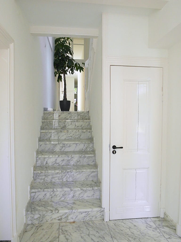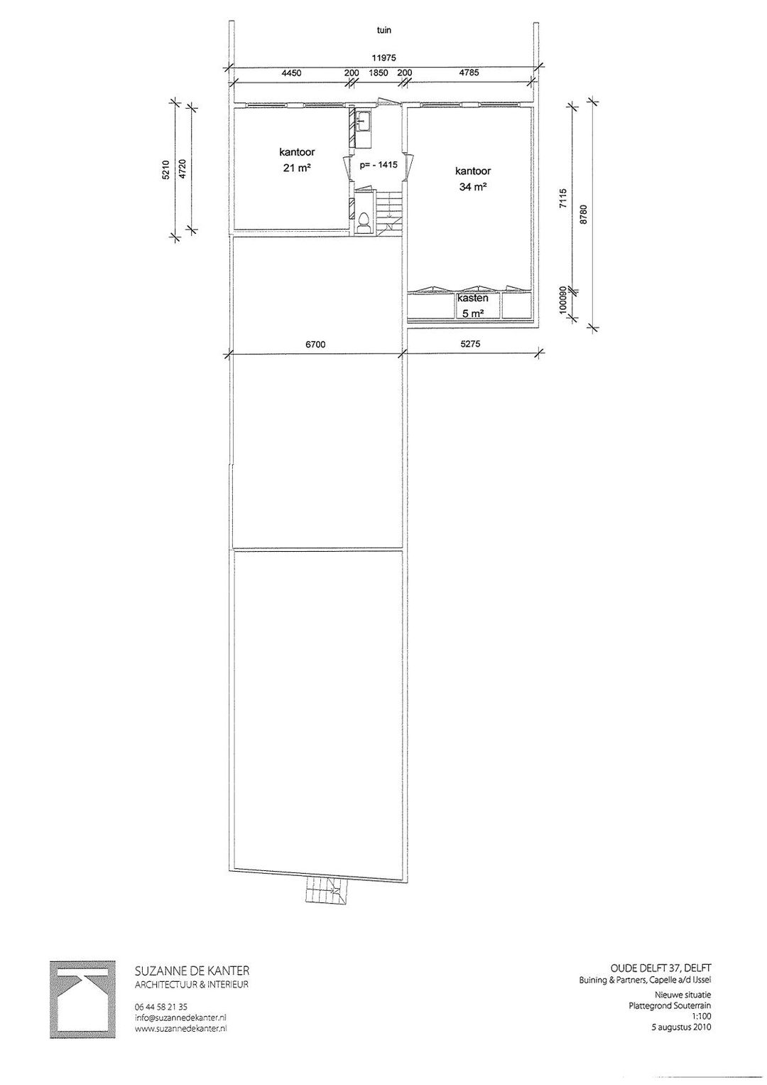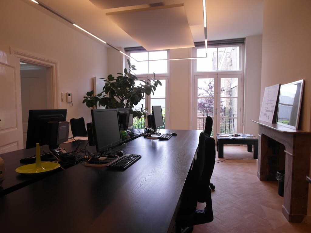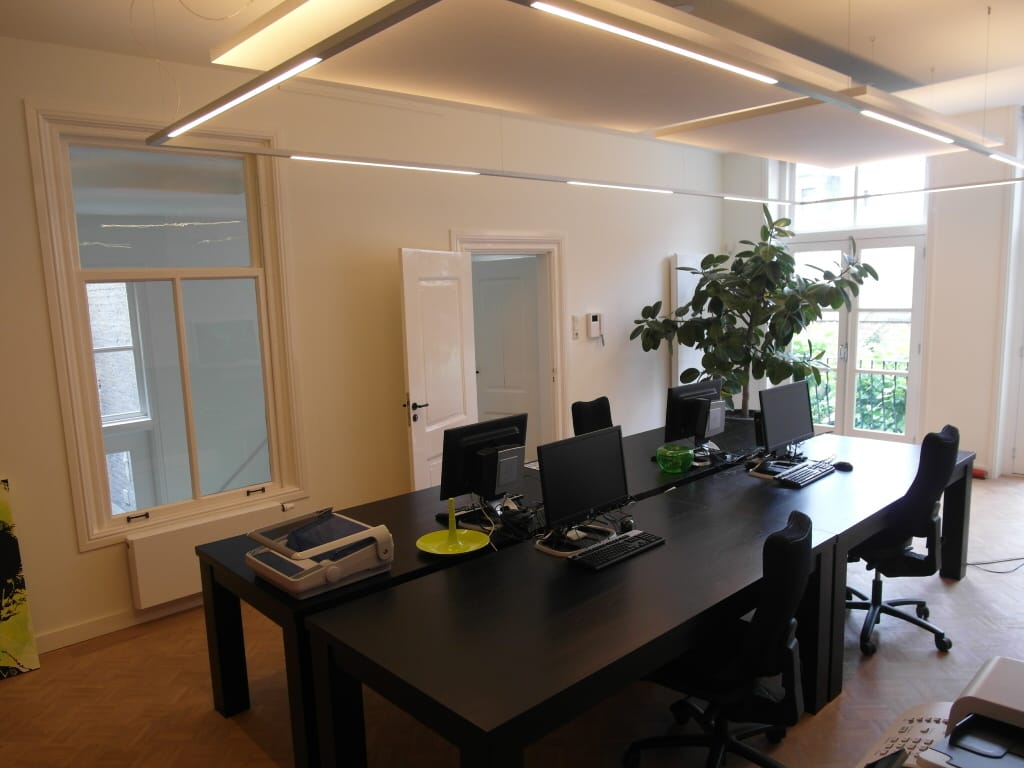 Kantoor (rechts achterin op de etage) 41m2 (excl. algemene ruimtes), veel daglicht en hoog plafond en openslaande deuren met uitzicht over de tuin.