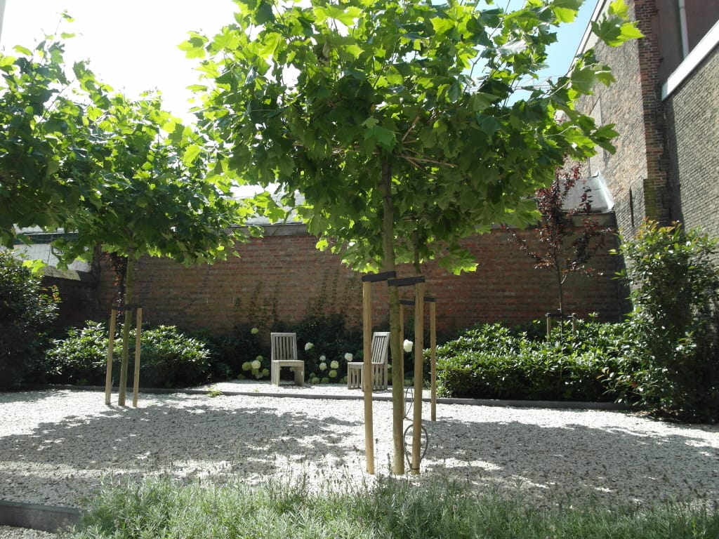 Fraaie stadstuin met dak platanen en grind bedekking.