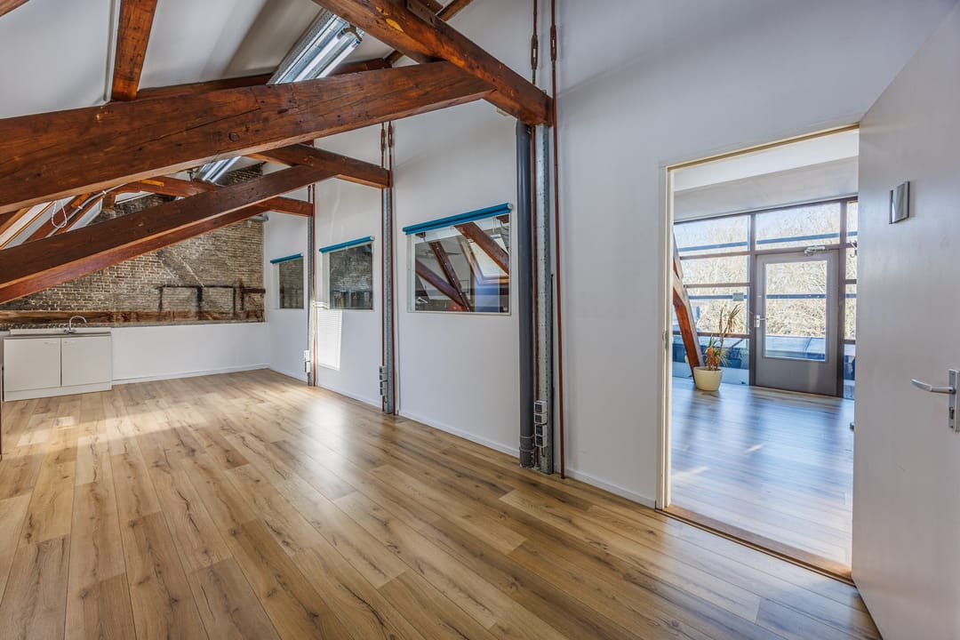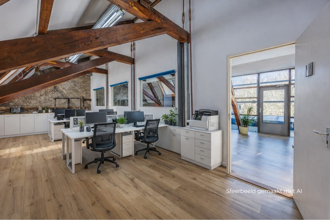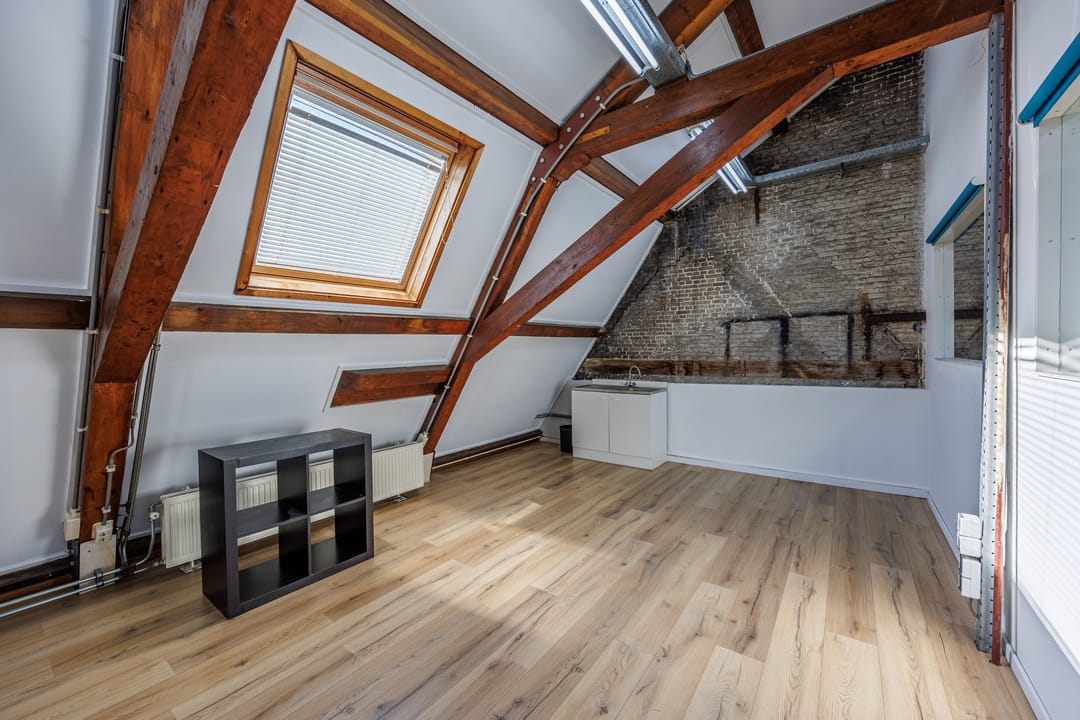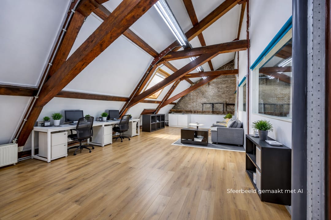 Deze unieke kantoorruimte onder de prachtige houten kapconstructie combineert charme, licht en karakter. De schuine wanden, het zichtbare balkenwerk en de hoge nok creëren een bijzondere werkruimte met een warme en inspirerende sfeer. Dankzij het grote dakraam komt er veel natuurlijk licht binnen, waardoor de ruimte fris en open aanvoelt.