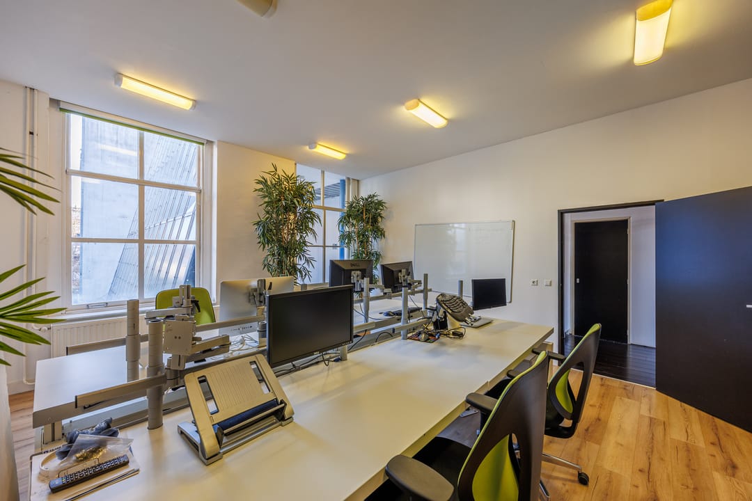 De kantoorunit is ruim opgezet en voelt door de grote ramen en lichte afwerking open en fris aan.
